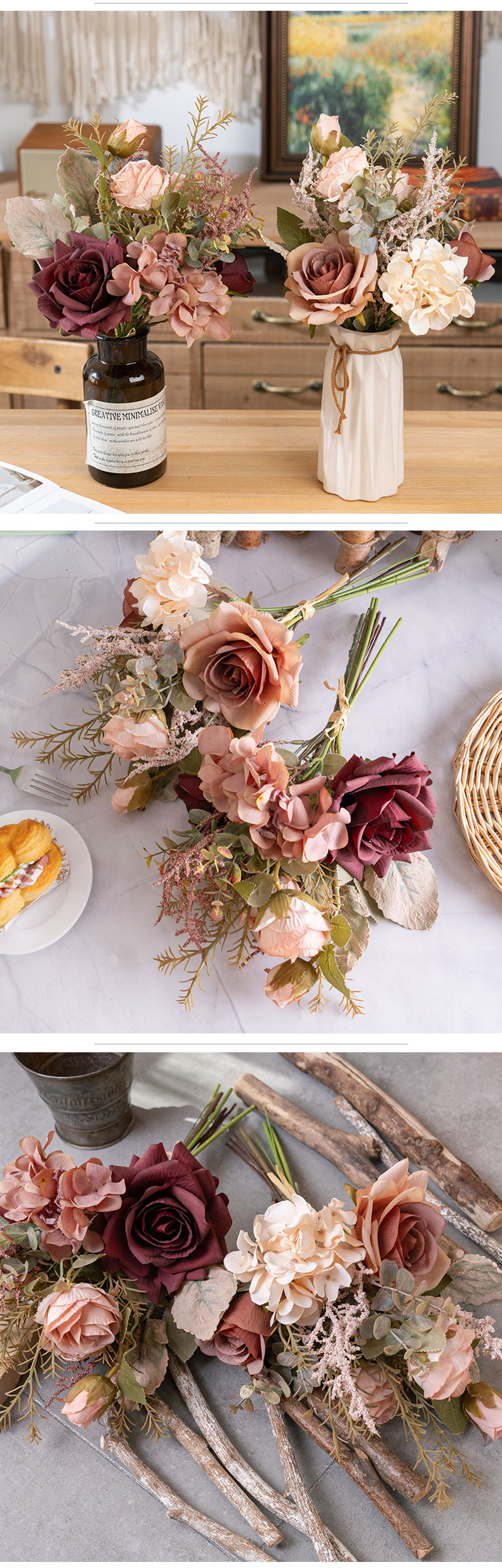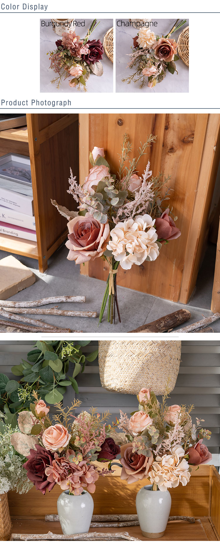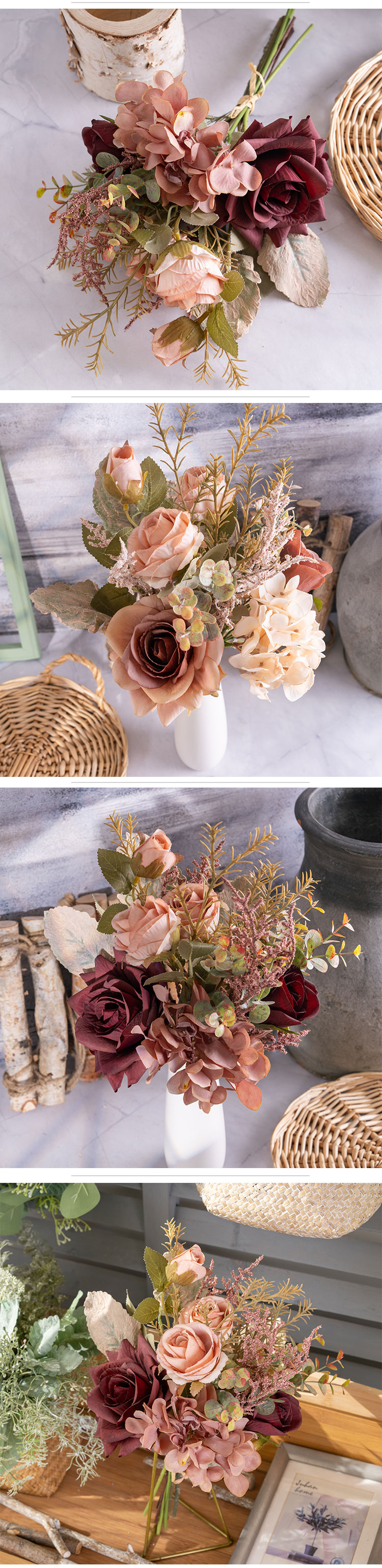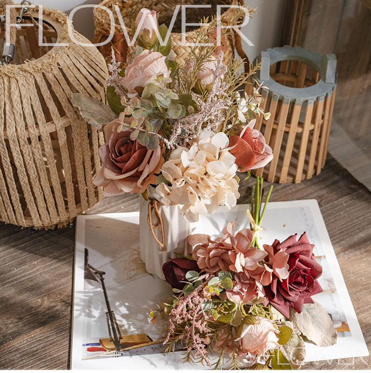 CF01335 নতুন ডিজাইনের কৃত্রিম ফ্যাব্রিক রোজ হেড রোজ বাড সিল্ক হাইড্রেঞ্জা পাতা স্লারি ওয়াটার ট্রিটমেন্ট সহ ডেকোর জন্য বান্ডিল