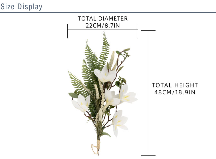 CF01032 stands tall at 48cm, weighing a mere 86.2g, CF01032 is lightweight, allowing for effortless handling and easy arrangement. Product package size 62*62*49cm. Its construction is formed from a delicate blend of 80% fabric, 10% plastic, and 10% wire—a combination that ensures both durability and a touch of softness. This blend of materials imbues CF01032 with a unique texture and allows it to exude a serene beauty that transcends time.