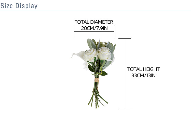 At CALLAFLORAL, we understand the importance of personalization. With a minimum order quantity MOQ of 75PCS, you have the freedom to mix and match to suit your preferences. In a captivating ivory color, these flowers exude a sense of sophistication while seamlessly complementing any setting or theme.For your convenience, our decorative flowers come securely packaged in a box along with a carton, ensuring their safe delivery. They weigh only 98.7g, allowing for easy handling and portability. With a length of 33cm, they create an impressive visual impact without overpowering the surroundings.