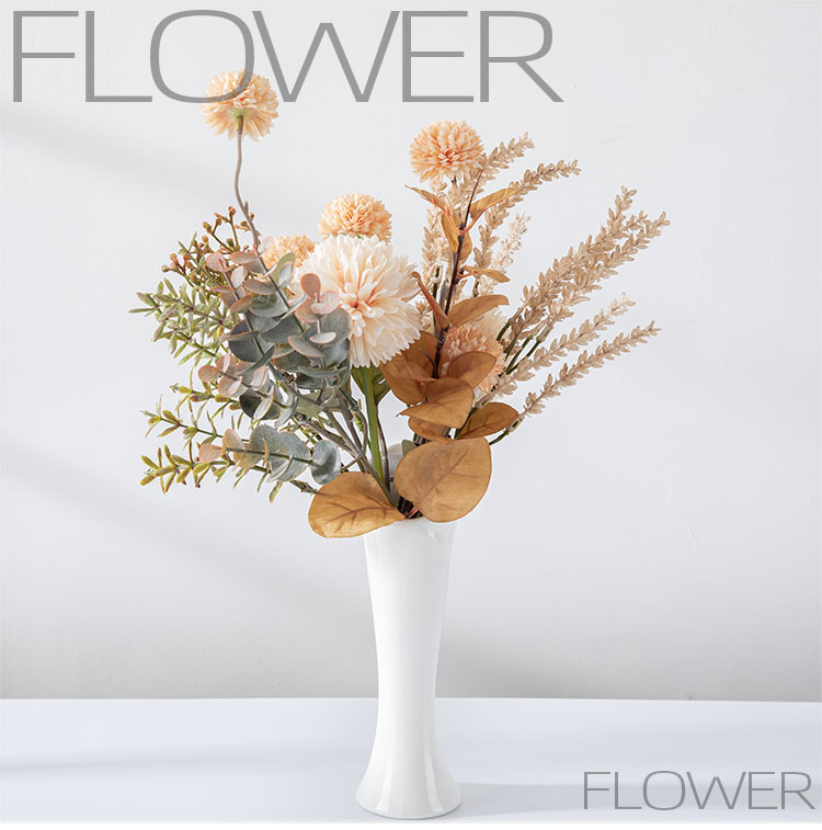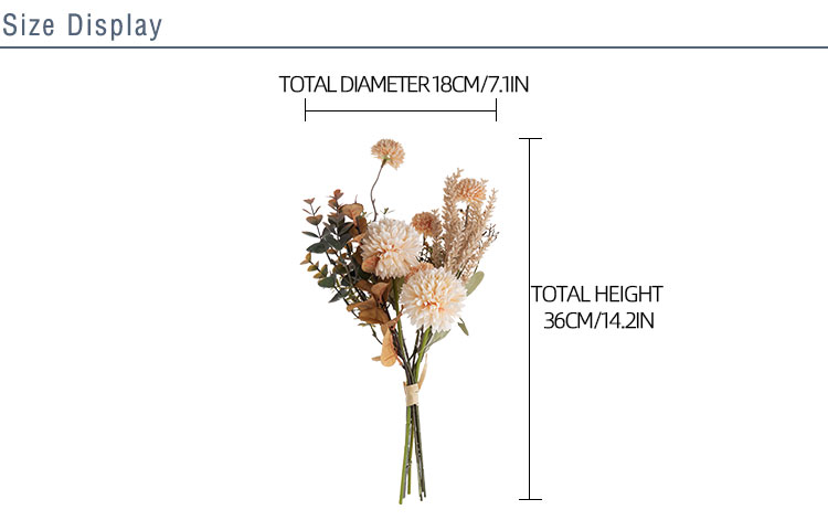 Champagne is the primary color of this artificial bouquet, giving it a sophisticated and classy look. This color choice allows the bouquet to complement a wide range of themes and color schemes. Whether you are hosting a formal event or a casual gathering, this bouquet will surely enhance the overall ambiance.The minimum order quantity for this product is 30pcs, weighing only 74.3g, it is easy to handle. The length of the bouquet is 36cm, allowing it to be displayed and admired from various angles.