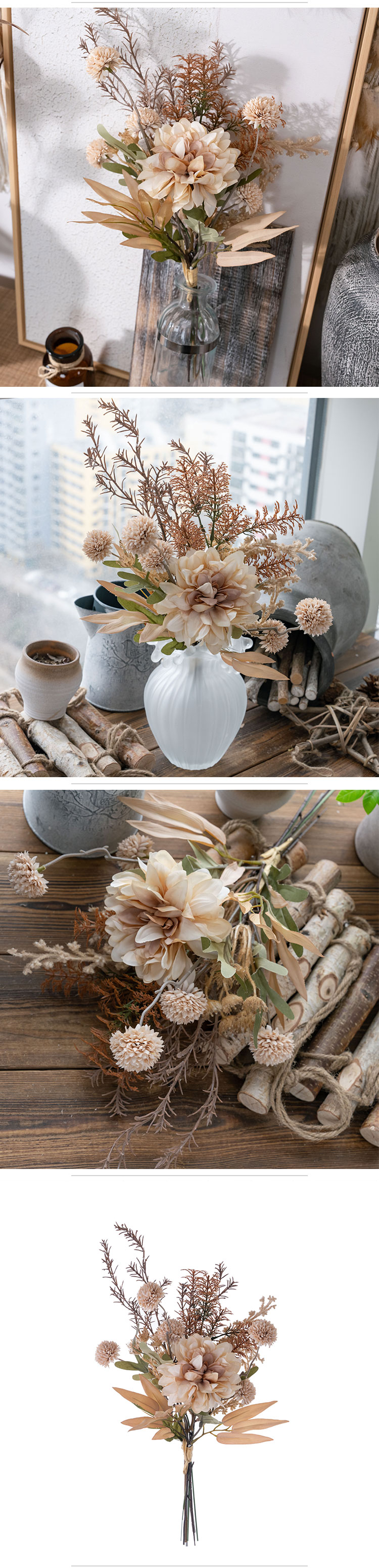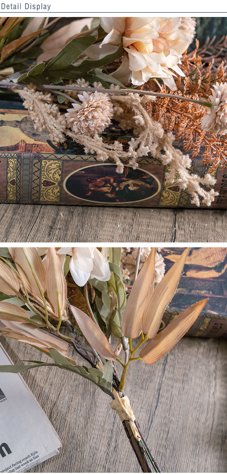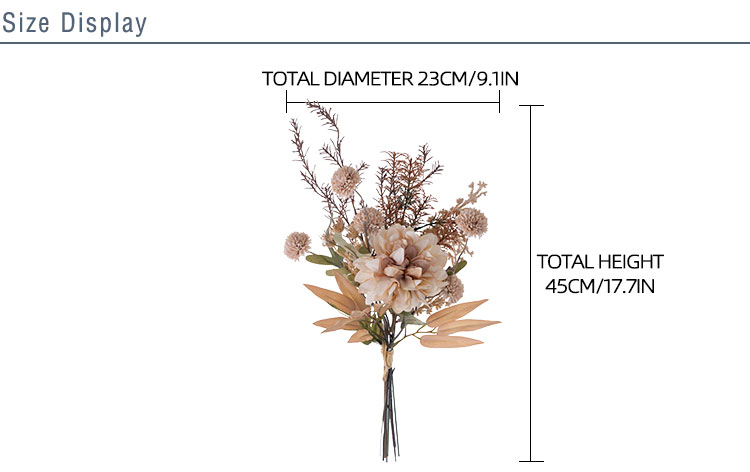 As a product of CALLAFLORAL, this Dahlia Dandelion Rosemary Bouquet has obtained ISO9001 and BSCI certifications, which is a testament to its high quality and compliance with international standards. It comes in a lovely beige color, a neutral tone that can seamlessly complement a wide range of decor styles, from modern minimalist to rustic charm.This versatile bouquet is suitable for a multitude of occasions. It can add a touch of elegance to your home, whether placed in the living room, bedroom, or any other room. It also works wonderfully in commercial settings such as hotels, hospitals, shopping malls, companies, and halls. Additionally, it serves as an excellent photographic prop, a beautiful decoration for exhibitions and supermarkets, and a perfect accent for weddings and outdoor events.