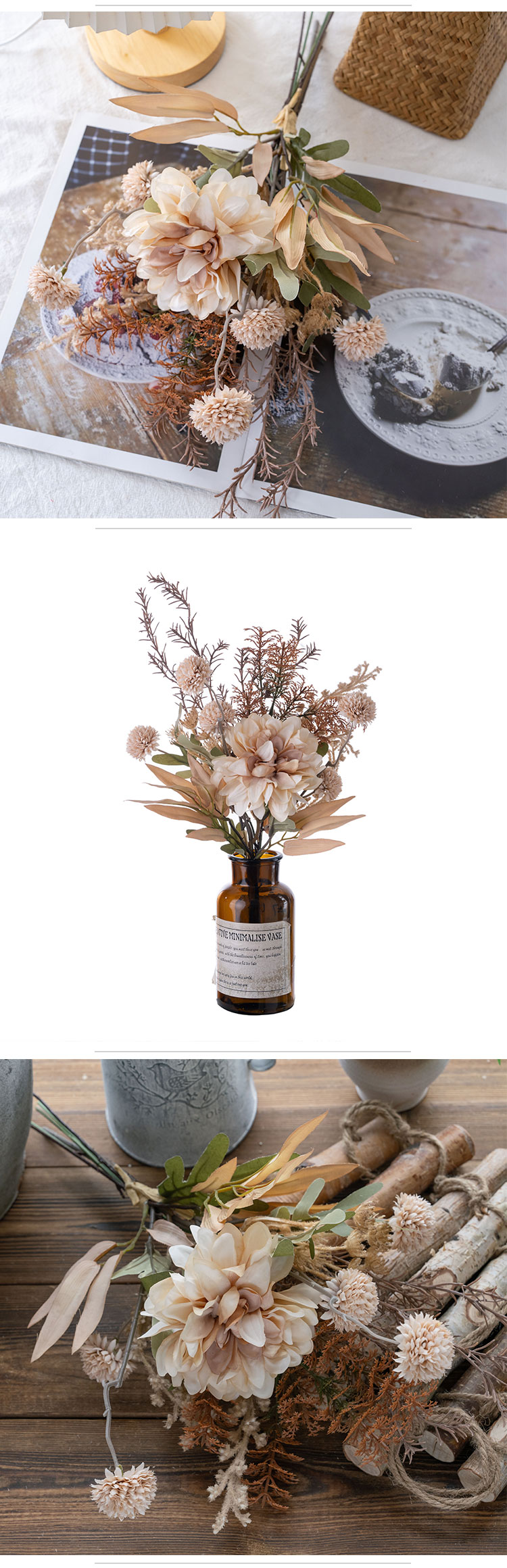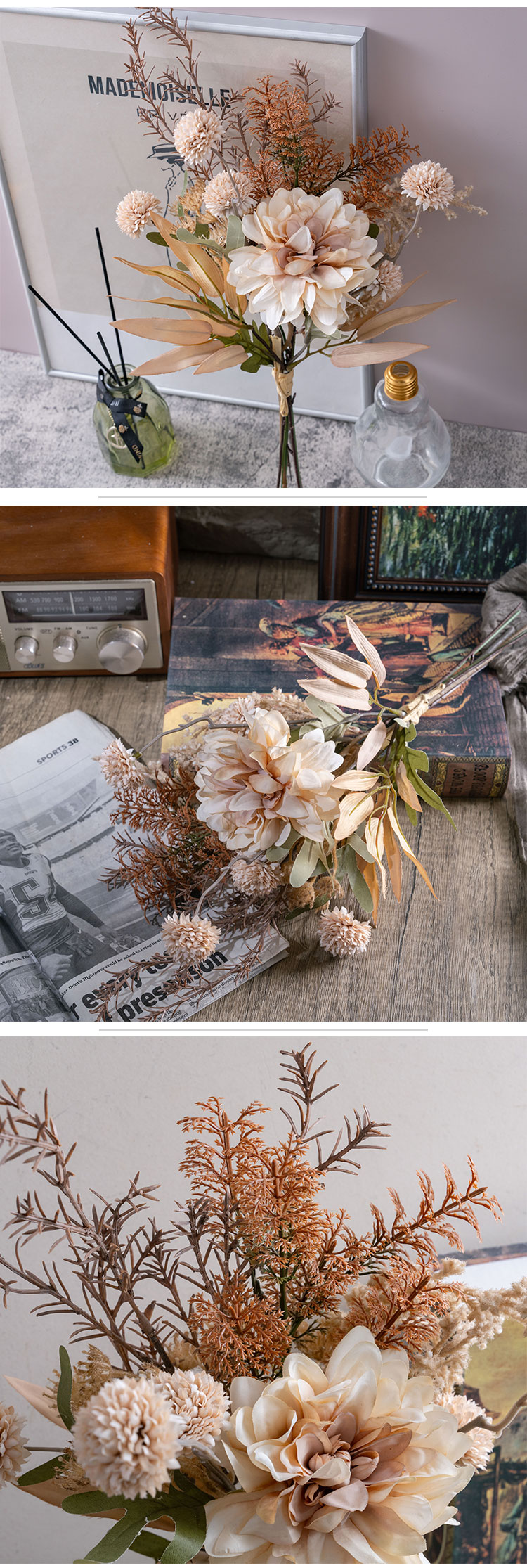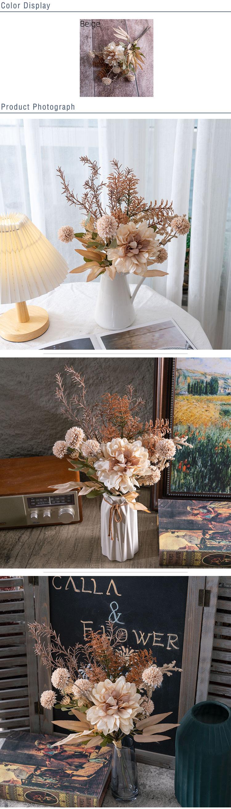 As a product of CALLAFLORAL, this Dahlia Dandelion Rosemary Bouquet has obtained ISO9001 and BSCI certifications, which is a testament to its high quality and compliance with international standards. It comes in a lovely beige color, a neutral tone that can seamlessly complement a wide range of decor styles, from modern minimalist to rustic charm.This versatile bouquet is suitable for a multitude of occasions. It can add a touch of elegance to your home, whether placed in the living room, bedroom, or any other room. It also works wonderfully in commercial settings such as hotels, hospitals, shopping malls, companies, and halls. Additionally, it serves as an excellent photographic prop, a beautiful decoration for exhibitions and supermarkets, and a perfect accent for weddings and outdoor events.