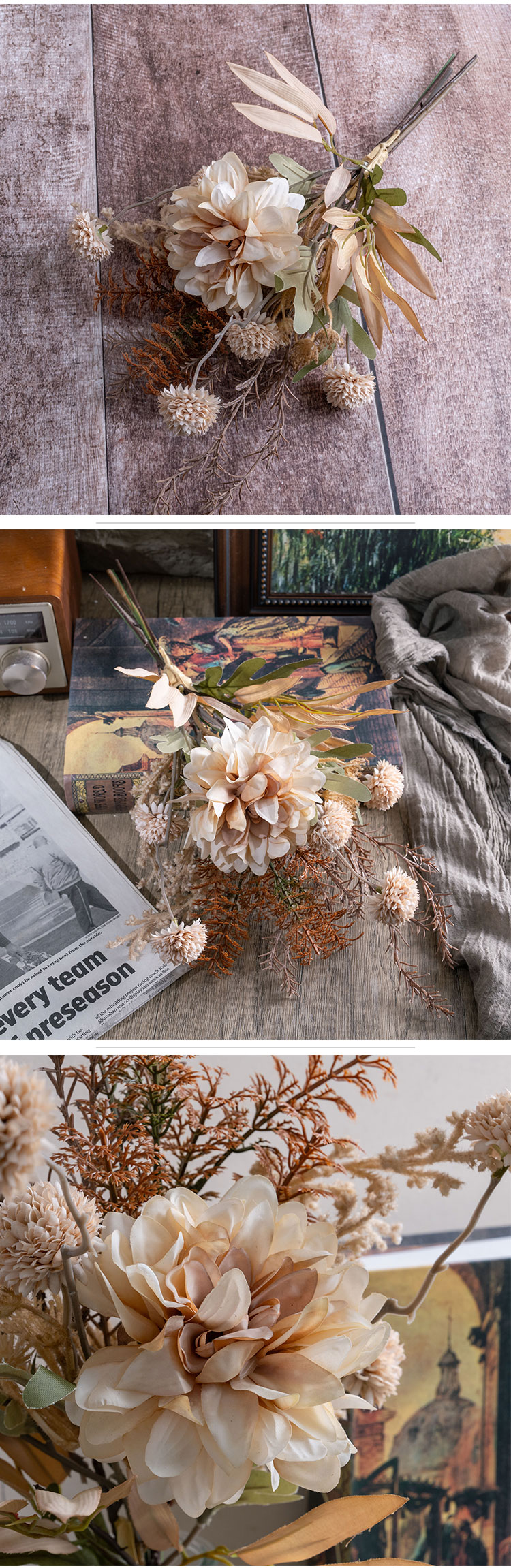 Presenting the exquisite Dahlia Dandelion Rosemary Bouquet, with the item number CF01273, a delightful creation from CALLAFLORAL, hailing from Shandong, China. This charming bouquet is set to bring a unique blend of natural beauty and versatility to any space or occasion.Crafted using a combination of fabric, plastic, and wire, this bouquet not only boasts a lifelike appearance but also ensures sturdiness and longevity. It has an overall height of 45cm, making it a substantial piece that can easily become a focal point in various settings. Weighing 75g, it strikes a perfect balance between being substantial enough to make an impact and lightweight enough for easy placement.