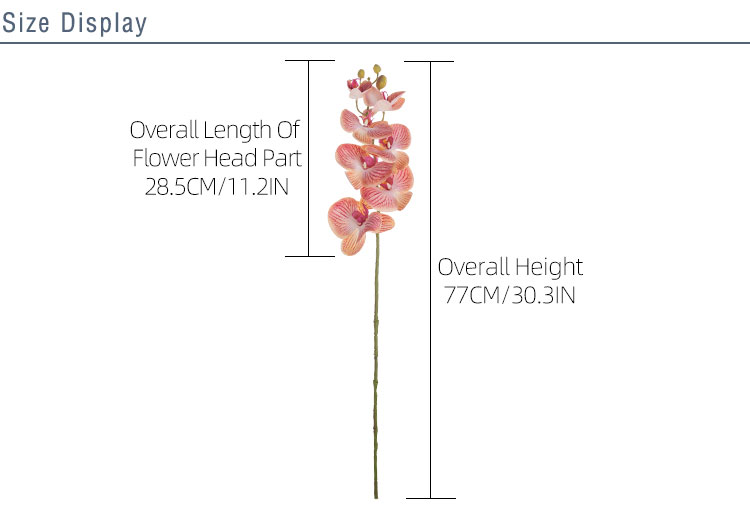 With an overall height of 77 cm and an overall length of the flower head part measuring 28.5 cm, these flowers make a bold statement. The large flower head has a diameter of 11.5 cm, while the small flower head measures 9.5 cm. The bud has a diameter of 5 cm. Each branch weighs 65.8g, making it easy to handle and arrange.The package includes 1 branch of our 7 Phalaenopsis. The inner box size is 100*24*12cm and can hold up to 24 branches. The packaging is designed to protect the delicate flowers during transportation, ensuring that they arrive in perfect condition.