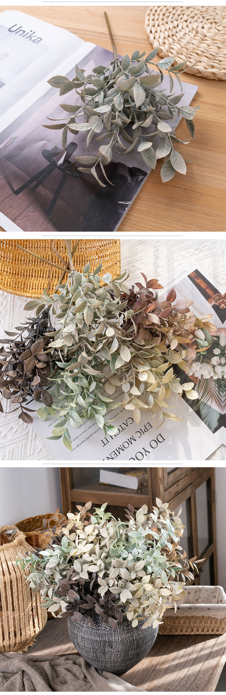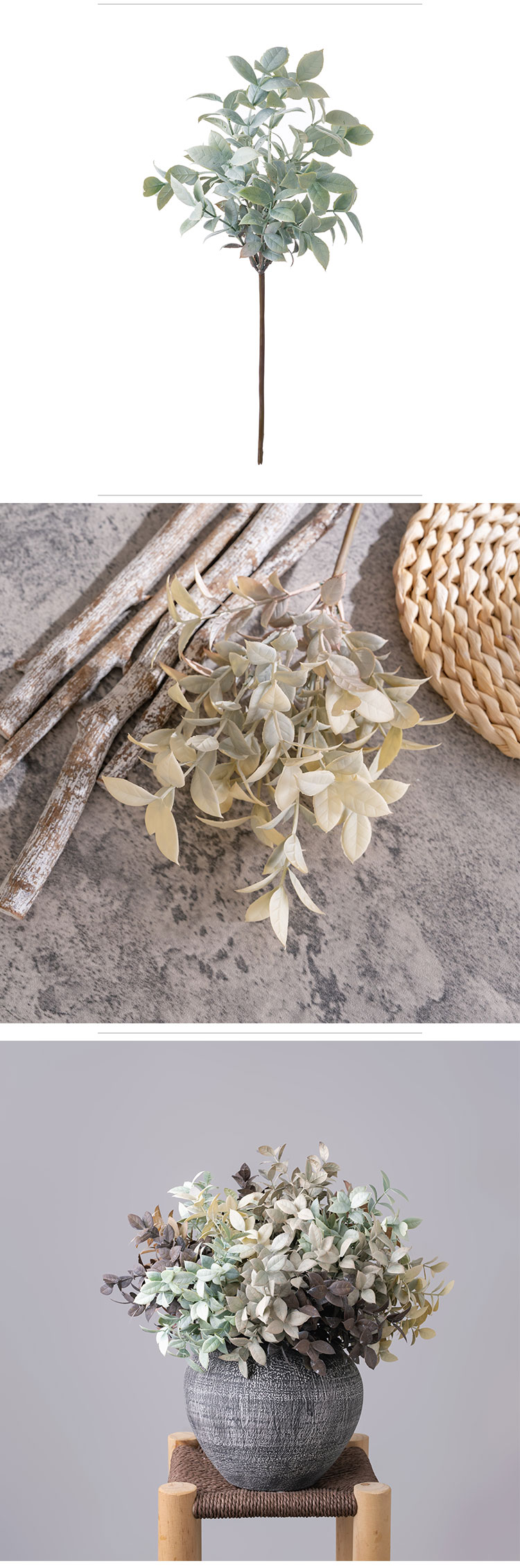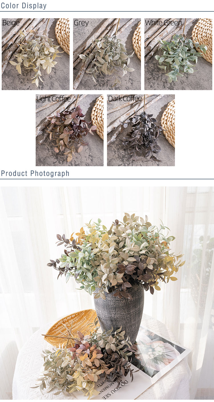Each purchased branch priced individually features 2 slender sub-branches, accented by a delicate mix of grass and leaves. This thoughtful composition mimics the organic growth of real eucalyptus, adding texture and depth that elevates its lifelike quality. The stem is available in a curated range of earthy hues—White Green, Grey, Beige, Light Coffee, and Dark Coffee—making it easy to complement everything from modern, minimalist interiors to cozy, rustic spaces.