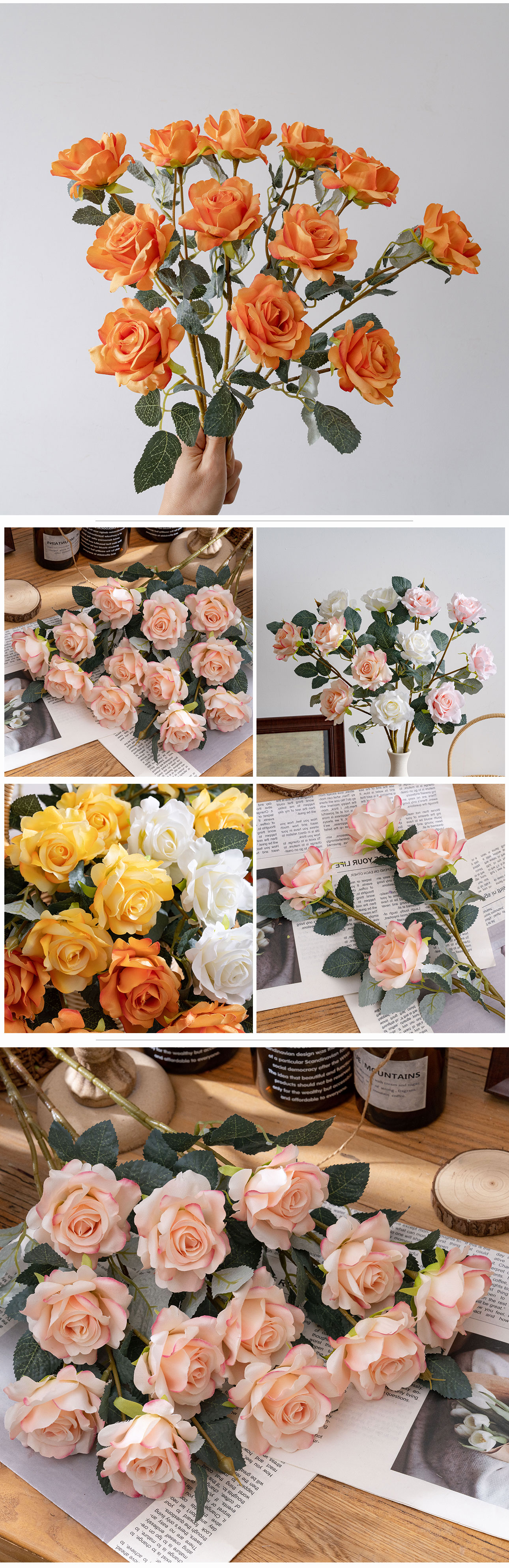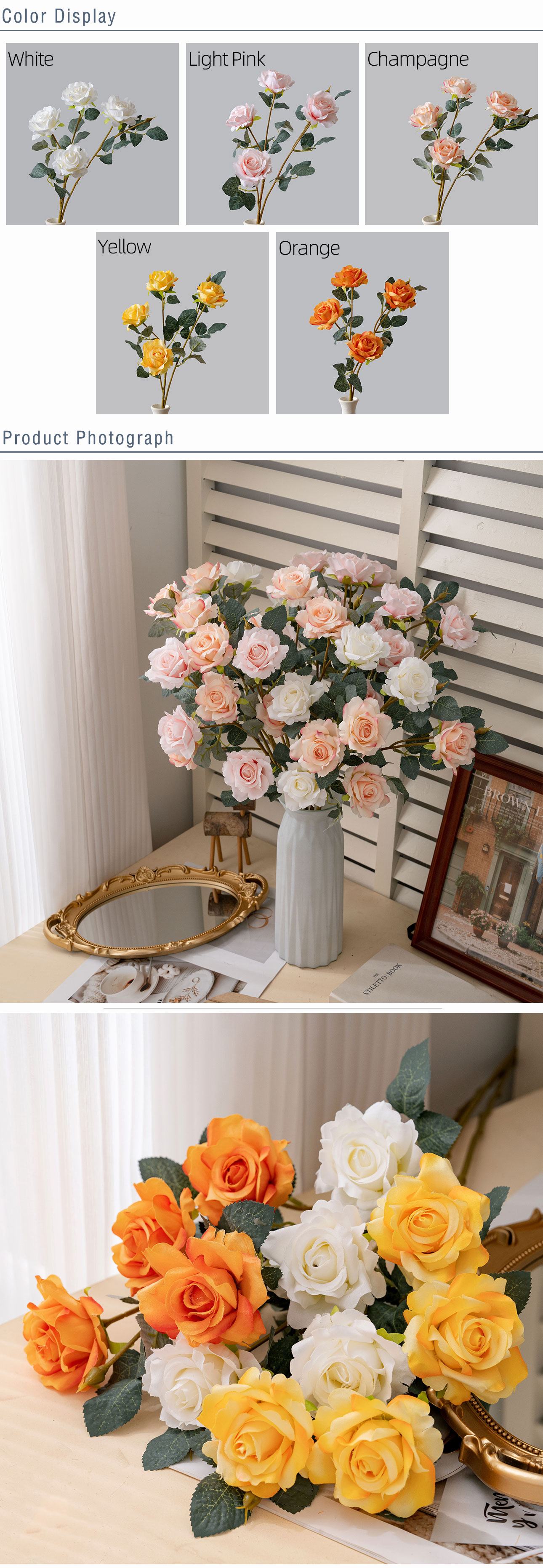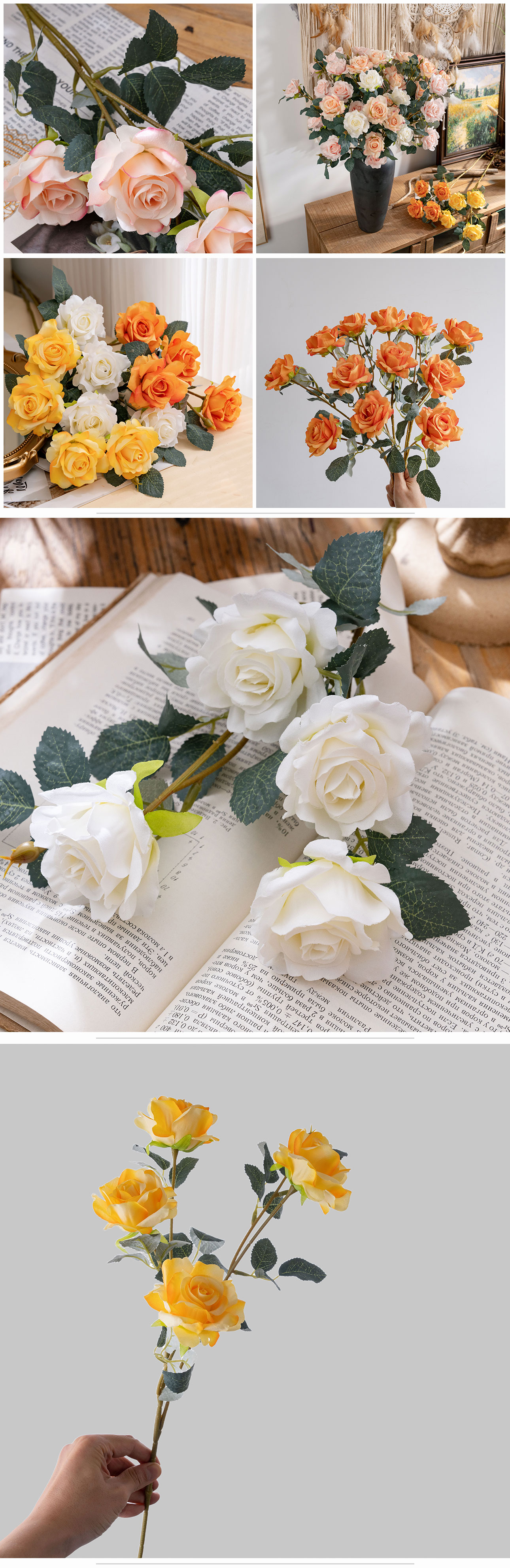 CALLAFLORAL Premium Artificial Rose Stem (Item No.: CL39010There’s something inherently romantic and comforting about the sight of a fresh rose—but what if you could capture that beauty forever, without the hassle of wilting petals, constant watering, or seasonal limitations?Introducing the CALLAFLORAL Artificial Rose Stem, a masterpiece of craftsmanship designed to bring the timeless allure of roses into your life, day after day, occasion after occasion. Meticulously crafted in Shandong, China—home to some of the world’s finest artificial flower production—this rose stem is more than just a decoration; it’s a versatile, long-lasting accent that adds warmth, sophistication, and a touch of nature to any settingAt first glance, you’ll be stunned by how lifelike this artificial rose is. Blending the artistry of handmade detailing with the precision of machine manufacturing, each petal boasts a soft, velvety texture that mimics the delicate feel of fresh rose petals. The edges of the petals are gently ruffled, just like a real rose in full bloom, while the subtle color gradients—from deep, rich hues to soft, muted tones—add depth and authenticity that’s hard to distinguish from the real thing. Crafted from high-quality fabric, durable plastic, and flexible wire, this rose stem strikes the perfect balance between realism and resilience: the fabric petals hold their shape beautifully, the plastic calyx and stem resist wear and tear, and the wire core allows you to bend and adjust the stem to fit any vase, arrangement, or display. At an elegant 64cm in overall height and a lightweight 46.1g, it’s the ideal size to stand tall as a single statement piece or blend seamlessly with other flowers in a bouquetChoose from five enchanting colors to suit your style and mood: luxurious champagne, soft light pink, pure white, sunny yellow, and vibrant orange. Whether you’re looking to add a touch of romance with light pink, create a crisp, elegant vibe with white, infuse warmth with champagne or yellow, or make a bold statement with orange, this rose stem has a shade for every taste. Its versatility doesn’t stop at color—this artificial rose is designed to shine in every setting, from the comfort of your home to high-traffic commercial spaces. Place it on your bedroom nightstand for a gentle wake-up call each morning, adorn your living room mantel to impress guests, or brighten up a hotel lobby, hospital room, or shopping mall with its cheerful presence. It’s the perfect addition to wedding centerpieces, bridesmaid bouquets, or ceremony backdrops, adding timeless romance to your special day. For businesses, it’s a cost-effective way to enhance exhibition halls, company reception areas, or supermarket displays, drawing attention and creating a welcoming atmosphere. Even outdoors, it holds up beautifully—use it to decorate patio tables, garden parties, or carnival booths without worrying about sun damage or wilting. And let’s not forget its value as a photographic prop: whether you’re shooting portraits, product photos, or event snapshots, this realistic rose adds a touch of elegance and charm that elevates any imageCelebrate every special moment with a flower that lasts as long as your memories. This artificial rose stem is the perfect companion for Valentine’s Day—gift it to your loved one as a symbol of enduring affection. It adds cheer to Women’s Day, Labor Day, and Children’s Day, and brings warmth to Mother’s Day and Father’s Day celebrations. For festive occasions like Halloween, Beer Festivals, Thanksgiving, Christmas, New Year’s Day, Adult’s Day, and Easter, it’s a versatile decor piece that fits seamlessly into any theme, from cozy and traditional to bold and festive. Unlike fresh roses that fade within days, this artificial rose retains its beauty for years, making it a thoughtful, long-lasting gift that your loved ones will cherishWhen you choose CALLAFLORAL, you’re choosing quality you can trust. Our products are certified by ISO9001 and BSCI, ensuring strict adherence to international quality standards and ethical production practices. Each order includes 1 premium artificial rose stem, and we offer convenient packaging options: inner boxes measuring 100×24×12cm, with 24 pieces per box—perfect for bulk purchases, retailers, or event planners. We also provide flexible payment methods, including L/C, T/T, West Union, Money Gram, and Paypal, making your purchase process smooth and hassle-free, whether you’re buying for personal use or businessSay goodbye to fleeting fresh flowers and hello to everlasting beauty with the CALLAFLORAL Artificial Rose Stem (Item No.: CL39010). It’s not just an artificial flower—it’s a way to bring joy, elegance, and a touch of nature into your life, no matter the season or occasion. Whether you’re decorating your home, planning an event, or searching for the perfect gift, this realistic rose stem is sure to impress with its craftsmanship, versatility, and timeless appeal.