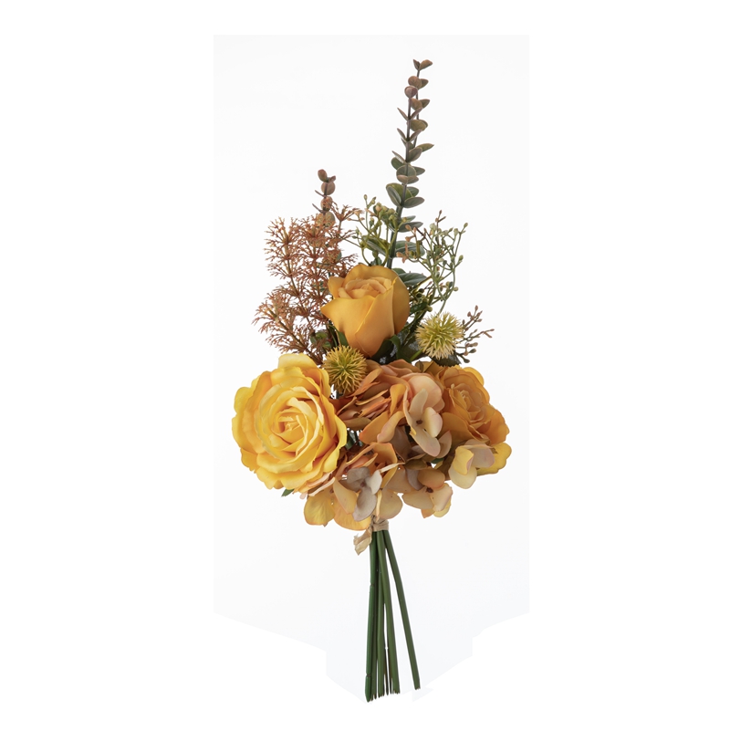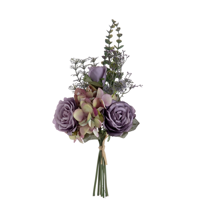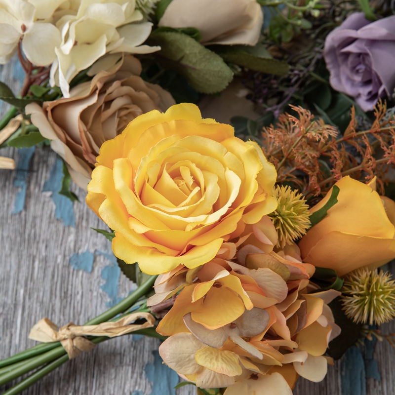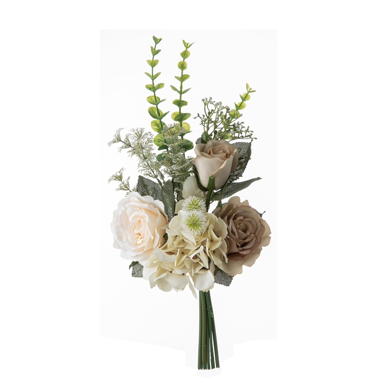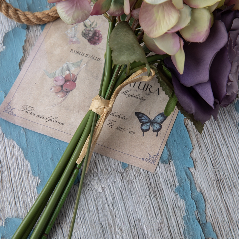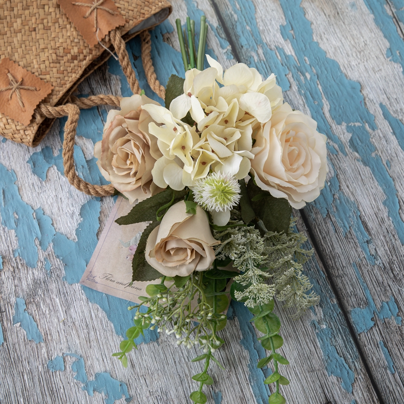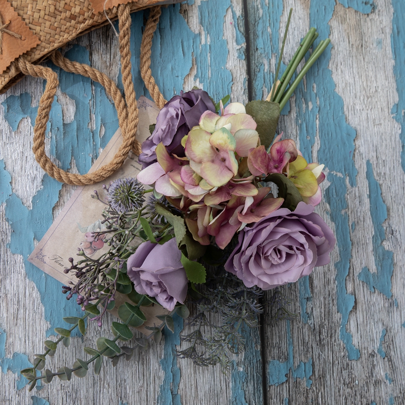 Measuring 43cm in overall height and 19cm in diameter, each half bunch comprises two rose heads, one rose bud, one hydrangea head, and several matching accessories, including leaves and grass. The rose heads stand at 5.5cm tall with a diameter of 8.5cm, while the rose bud measures 5.5cm in height and 5cm in diameter. The hydrangea head boasts a height of 10cm and a diameter of 12cm, creating a visually captivating arrangement. Despite their striking appearance, these half bunches are lightweight, weighing just 86g, making them easy to handle and display.