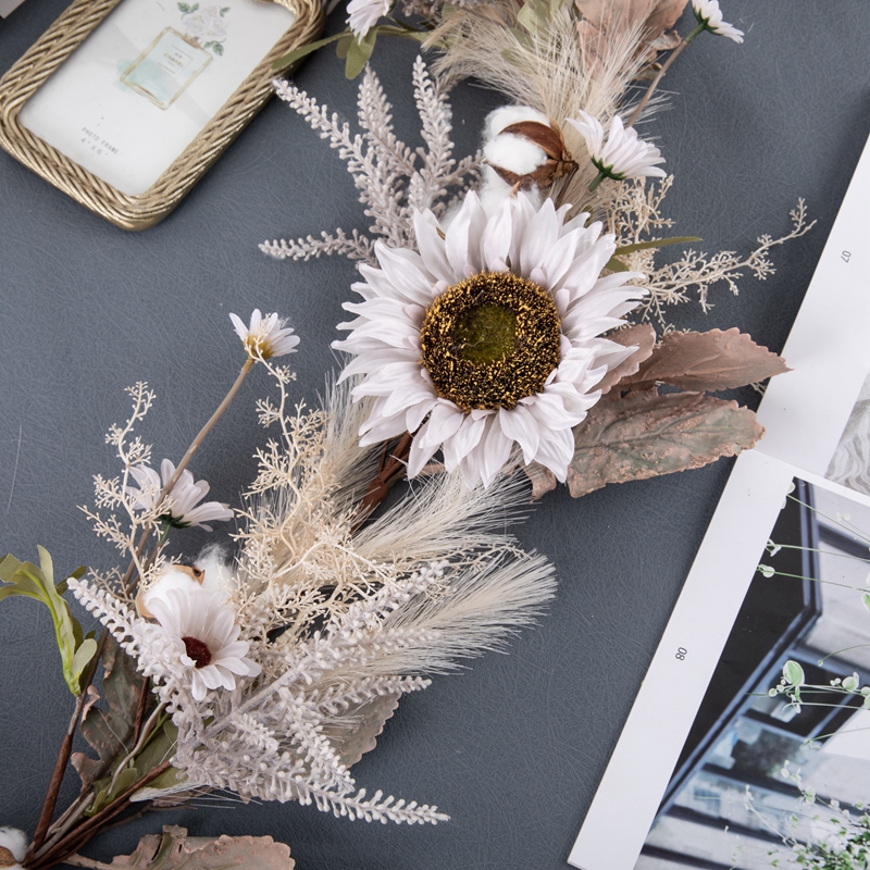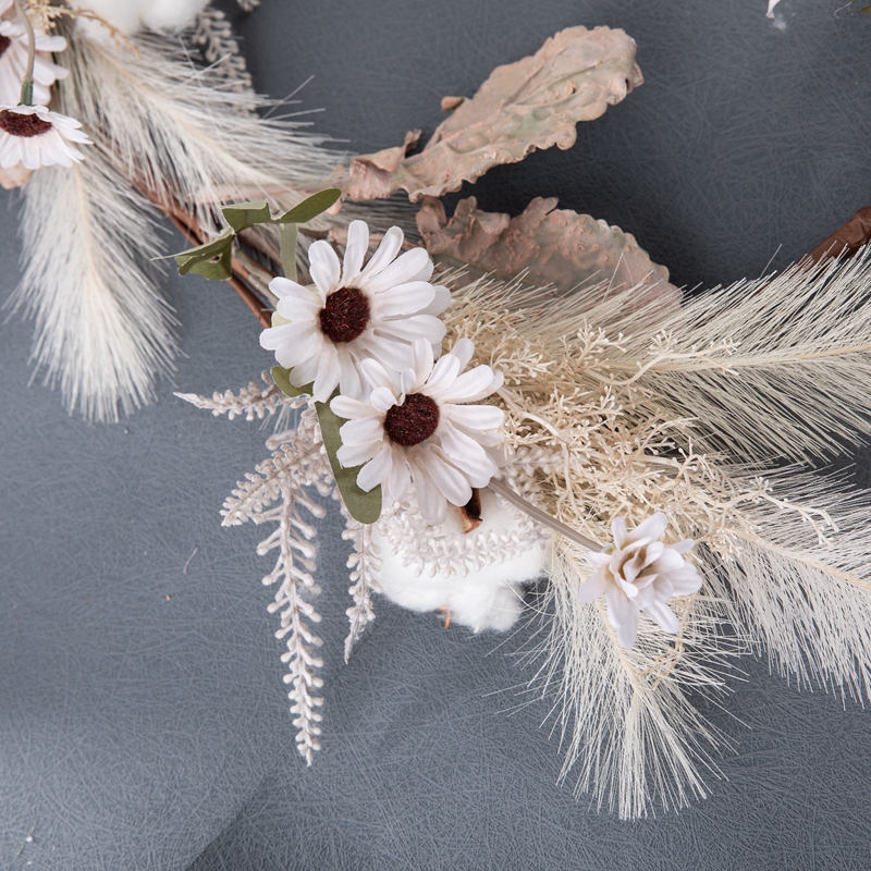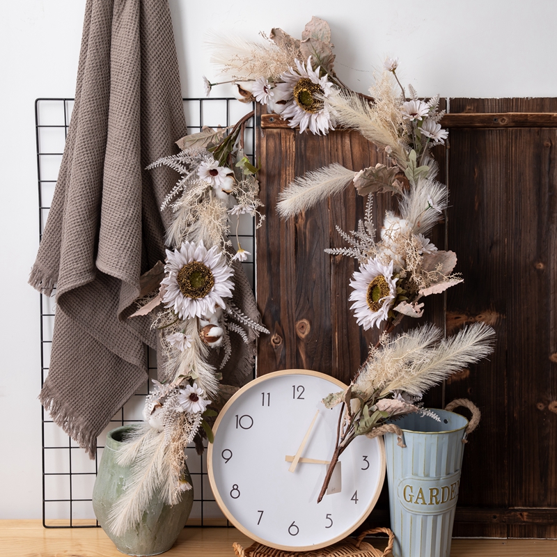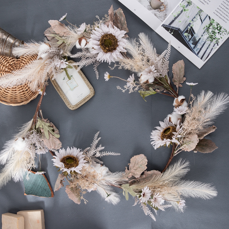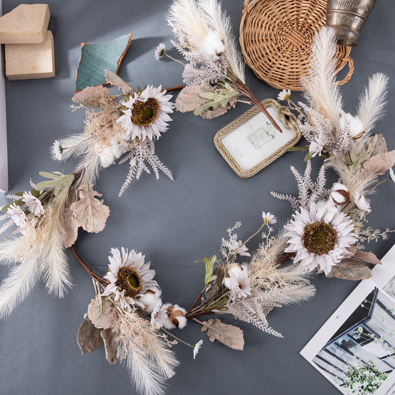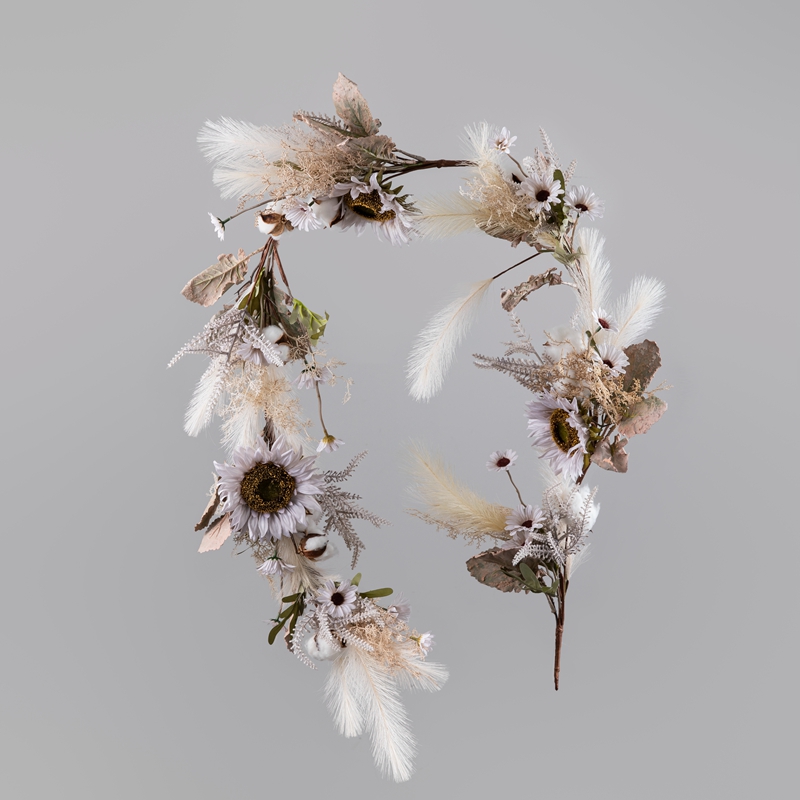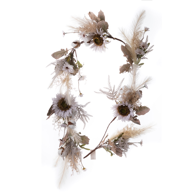 The sunflowers at the heart of this vine exude a warm, inviting glow, their golden petals radiant in the light. They serve as the centerpiece, drawing the eye and inviting a sense of joy and positivity into any environment. The fluffy grasses, on the other hand, add a playful and ethereal touch, their soft textures inviting tactile exploration. The cotton fibers, lightweight and airy, complete the picture, creating a visual symphony of natural textures and hues.