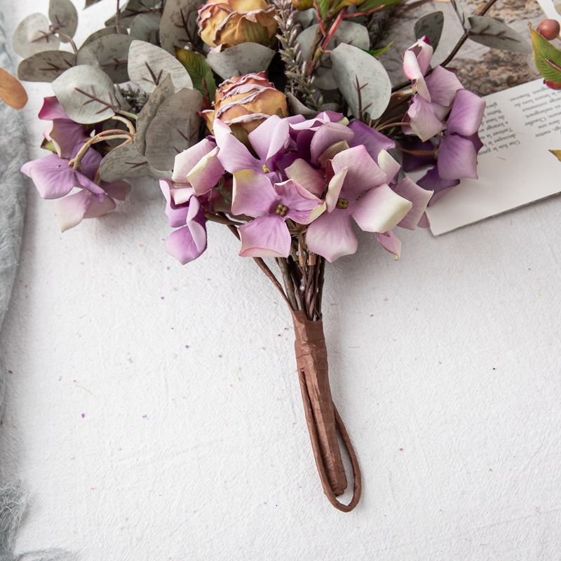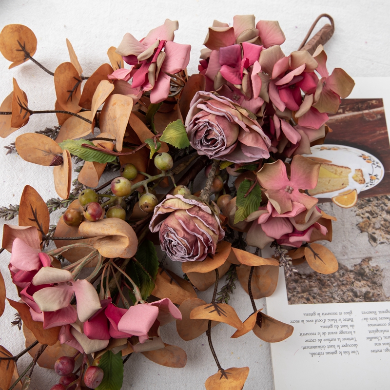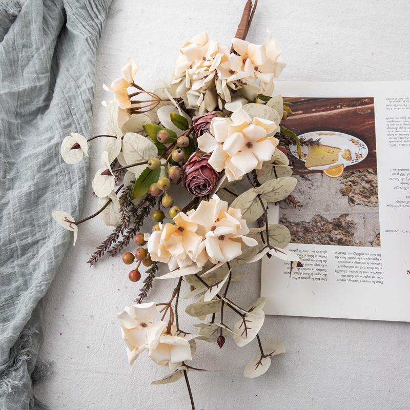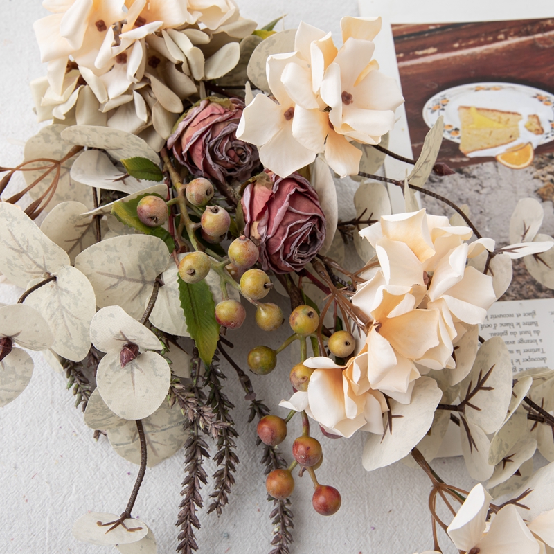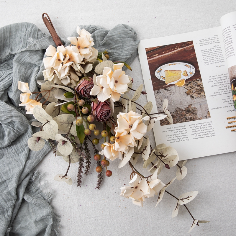 Weighing 114.5g, the Eucalyptus Hydrangea Charm strikes the perfect balance between lightweight and substantial, ensuring easy handling and versatile display options. Each bunch is priced to include 9 groups of hydrangeas, two dry-roasted rose heads, 2 groups of small berries, as well as apple leaves and fluffy grass, offering a rich and multi-dimensional aesthetic that elevates any space.