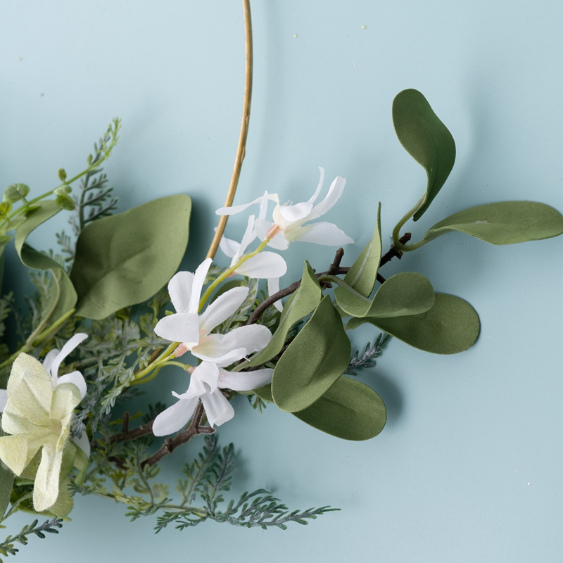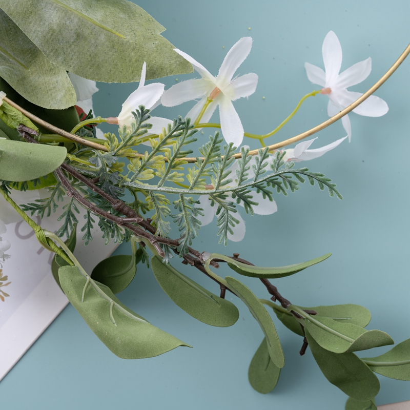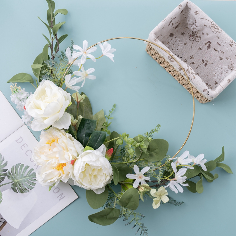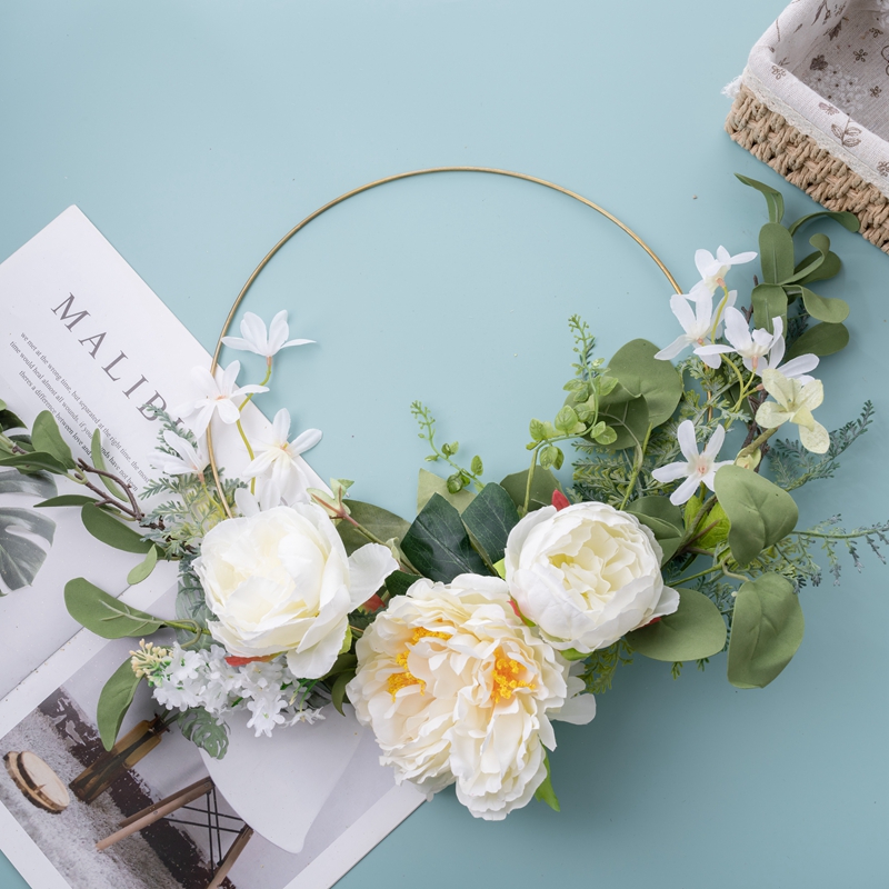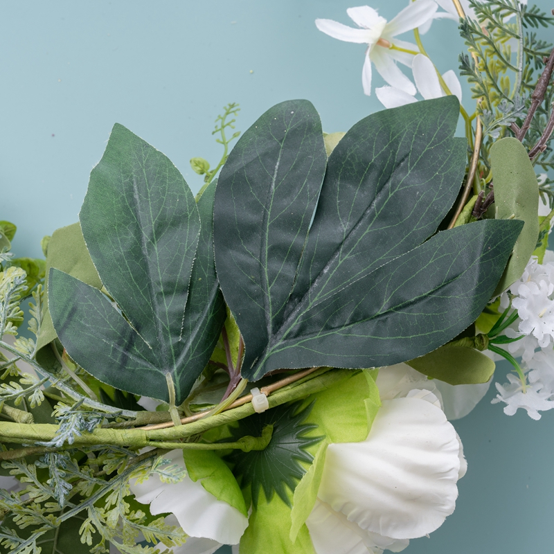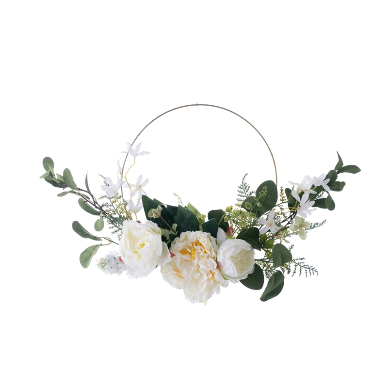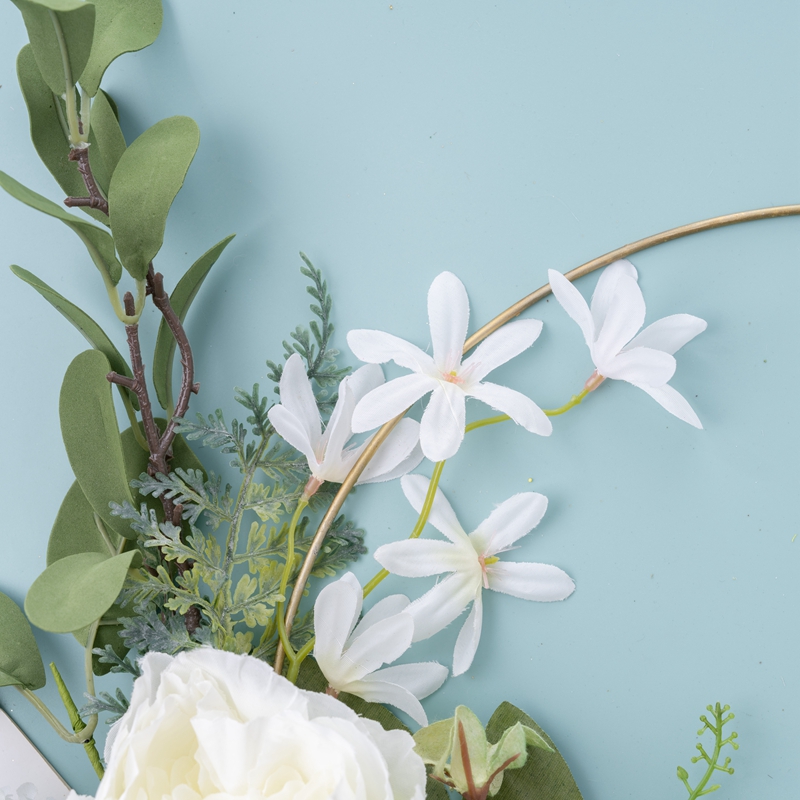 Bródúil as trastomhas iomlán de 57cm, an CL54571 Peony Leathfhleasc thimpeallacht gracefully aon spás le teagmháil le sofaisticiúlacht scagtha. Léiríonn a dearadh casta cothromaíocht íogair idir ceann mór peony feiceálach, ag tomhas 14cm ar trastomhas agus 6cm ar airde go hiontach, agus dhá cheann peony fíorálainn, gach ceann acu 7cm ar trastomhas agus 5cm ar airde. Tá na peonies seo, a léiríonn rathúnas agus dea-fhortún, socraithe go cúramach i measc taipéis de bhláthanna agus féara comhlántacha, gach eilimint roghnaithe go cúramach chun áilleacht iomlán an fhleasc a chomhlánú agus a fheabhsú.