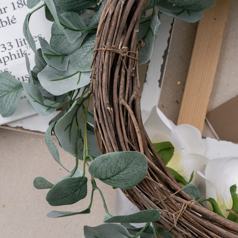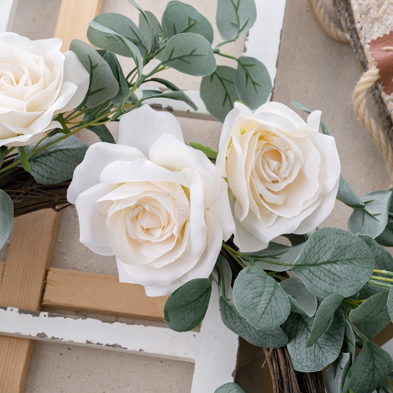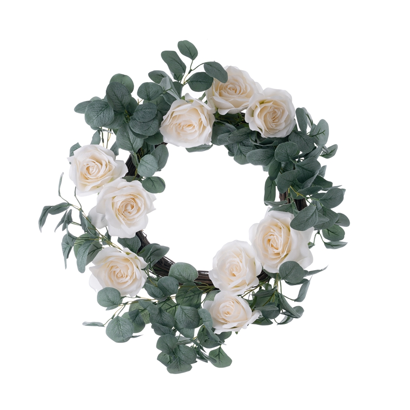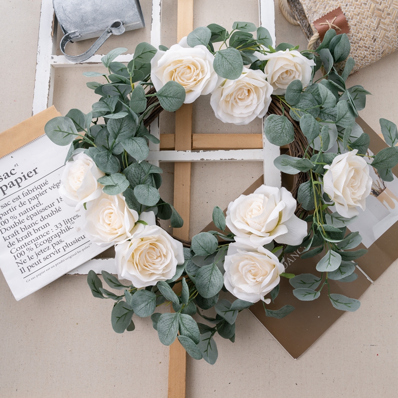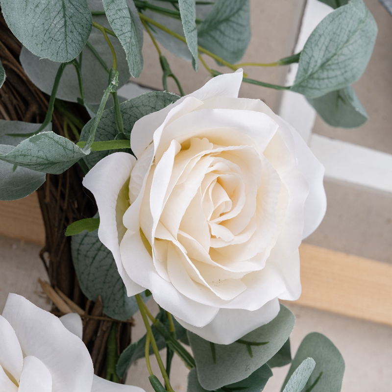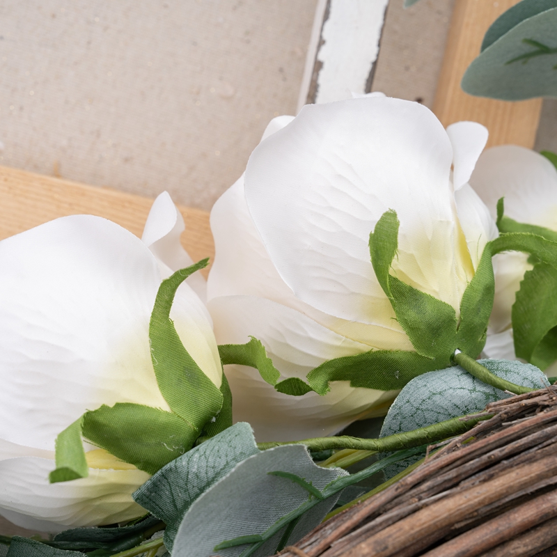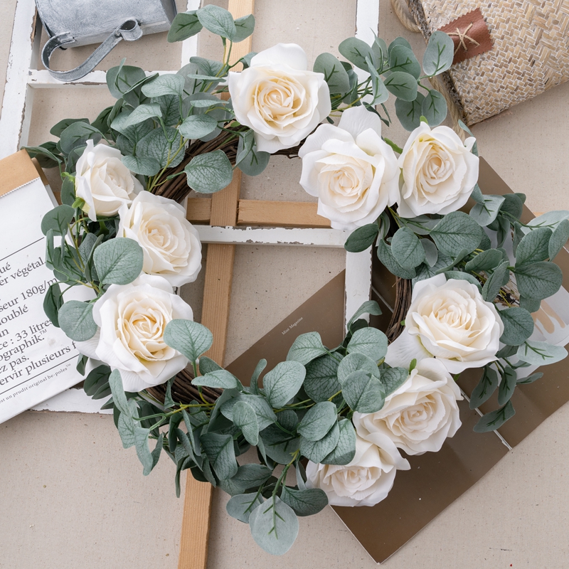 Tá trastomhas iomlán na bláthfhleasc 53cm go hiontach, agus tá trastomhas 35cm ag an bhfáinne istigh. Cuireann na bláthanna rósaí iontacha, gach ceann acu le trastomhas 10cm, teagmháil le mórgacht agus opulence leis an gcruthú fíorálainn seo. Comhlánaithe ag craobhacha íogaire eucalyptus, taispeánann an bláthfhleasc seo braistint de ghreann nádúrtha agus de mhionchoigeartú nach bhfuil a leithéid riamh cheana.