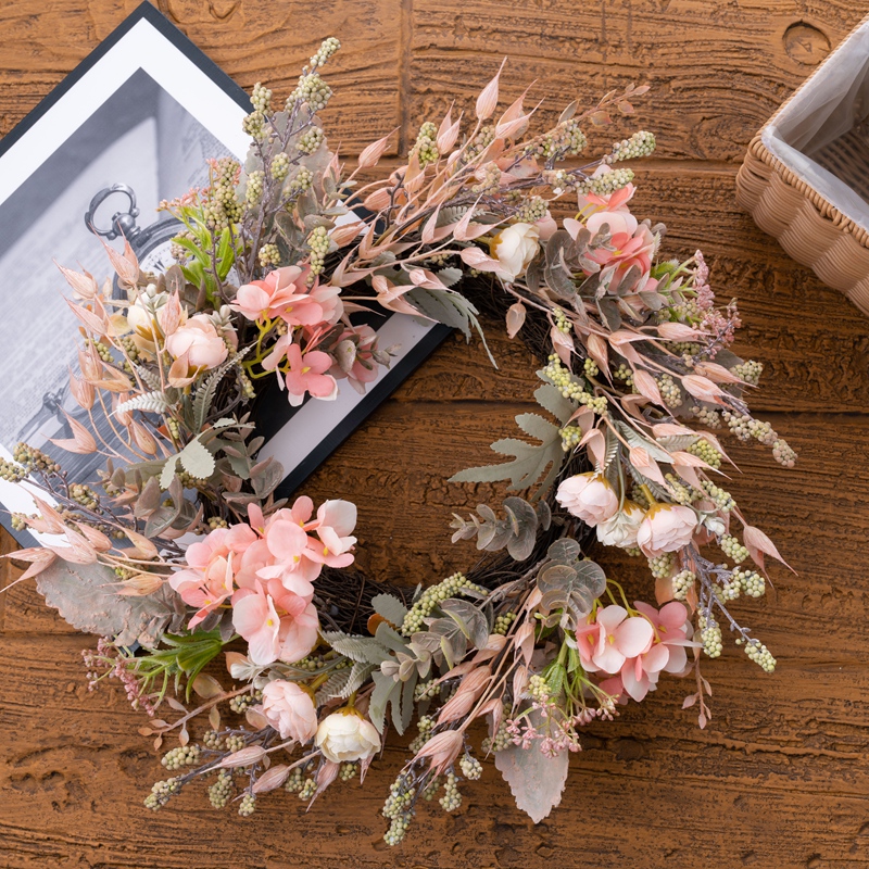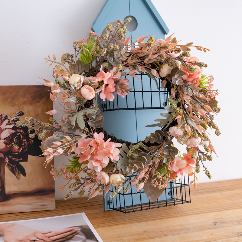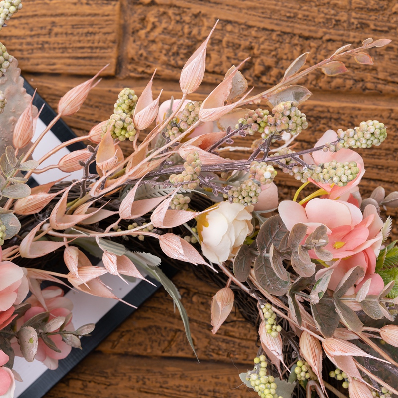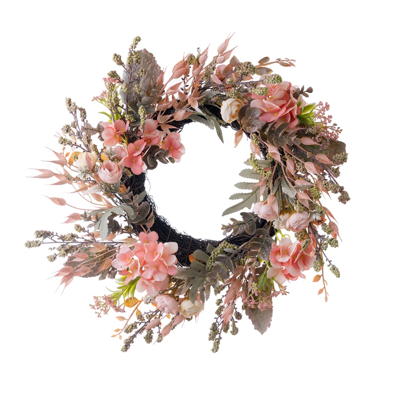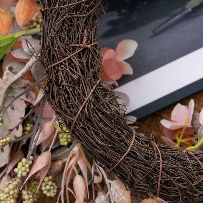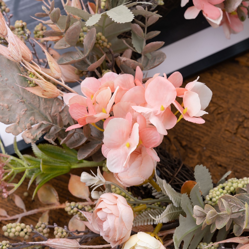 A auna diamita na zoben waje na 40.32cm da diamita na zoben ciki na 25cm, PL24011 ya nuna haɗin abubuwan halitta masu jituwa waɗanda ke jan hankalin hankali. A tsakiyar wannan furen akwai kawuna masu kyau na ƙasa, kowannensu yana tsaye da tsayin santimita 2, an ƙawata su da kawunan furanni masu girman santimita 3 mai ban sha'awa. Waɗannan furanni masu laushi suna cike da tarin hydrangeas masu ban mamaki, buɗaɗɗen hatsi, rassan kumfa, chrysanthemums na ganyen azurfa, da zoben rassan katako, suna ƙirƙirar simfoni na gani wanda ke jan hankali da kwantar da hankali.