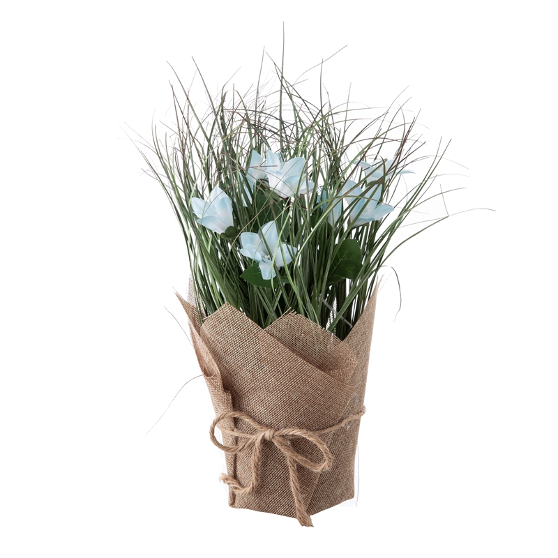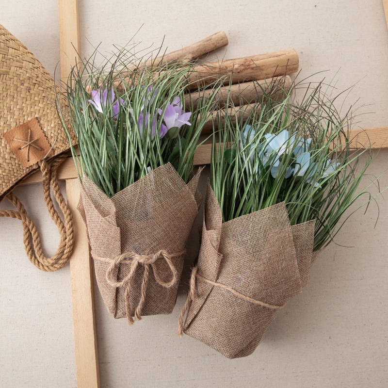 גולת הכותרת של הסדר זה, עם זאת, טמונה בפירוט המורכב שלו. עציץ הפלסטיק עטוף באלגנטיות בשני שקי פשתן מרובעים, כל אחד באורך צד של 31 ס"מ, מה שמוסיף נופך של חמימות ומרקם לאסתטיקה הכללית. שקים אלה נקשרים בצורה מאובטחת בחוט, מודגשים עוד יותר על ידי קשת פתילים מקסימה, מעניק קסם כפרי אך מעודן ליצירה.