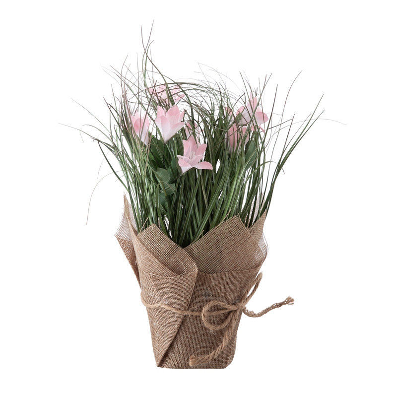 עציץ העשב CL57506, עומד בגובה 37 ס"מ מרשים, שובה לב עם הצללית החיננית שלו. העציץ עצמו, בגודל 8.8 ס"מ גובה ו-11.5 ס"מ קוטר, עשוי מפלסטיק איכותי, המבטיח עמידות ואריכות ימים. העיצוב המלוטש שלו משלים את הקסם הכפרי של עשב הקנים והנרקיסים העדינים, ויוצר תערובת הרמונית של טקסטורות וגוונים.