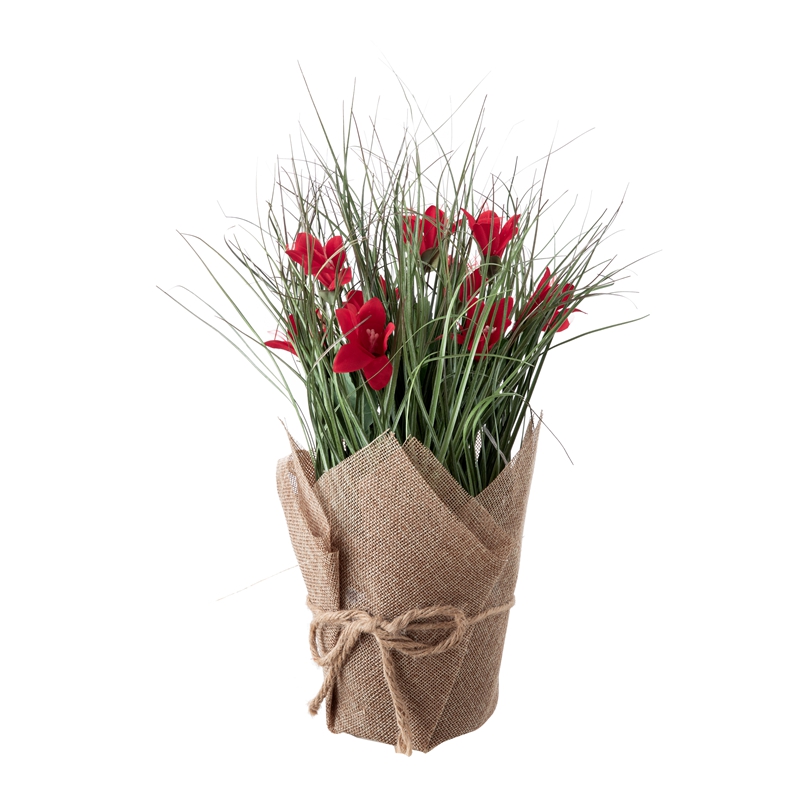 בתוך העציץ העטוף להפליא הזה שוכנים כמה צרורות של עשב קנה, גבעוליהם הארוכים והדקים יורדים בחן, יוצרים תחושה טבעית ואורגנית. בין הקנים הללו שזורים מספר ראשי פרחי נרקיסים, כל אחד מהם בגובה של כ-3.8 ס"מ וקוטר של 2.5 ס"מ עד 3 ס"מ, עלי הכותרת הצהובים והתוססים שלהם בולטים כמו משואות של שמחת אביב. הנרקיסים האלה לא רק מוסיפים פופ של צבע אלא גם מסמלים לידה מחדש והתחלות חדשות, מה שהופך אותם לבחירה המושלמת למגוון רחב של אירועים.