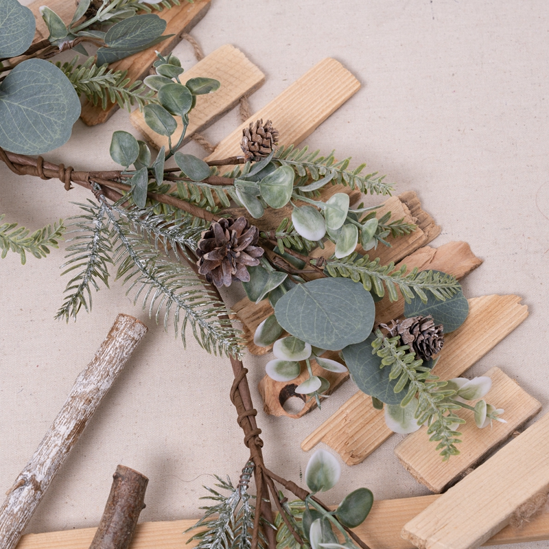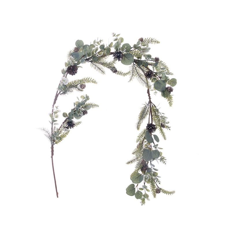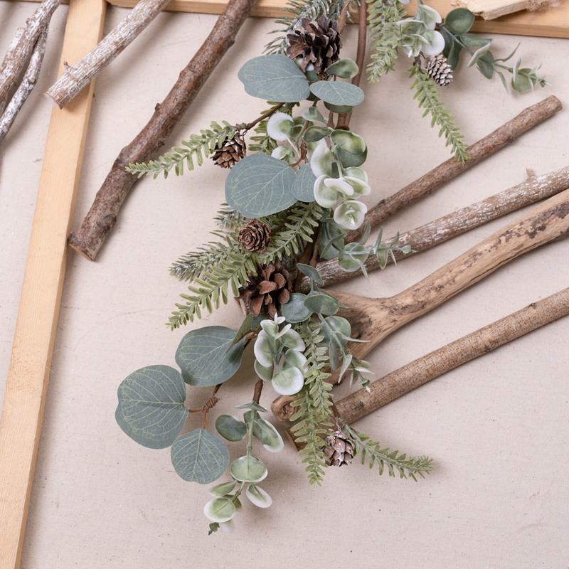 សូមស្វាគមន៍មកកាន់ពិភពនៃធម្មជាតិ ជាពិភពលោកដែល CL54682 ពី CALLAFLORAL ដើរតួនាទីកណ្តាល។ បំណែកដ៏ប្រណិតនេះគឺជាការលាយបញ្ចូលគ្នាដ៏អស្ចារ្យនៃផ្លាស្ទិច ក្រណាត់ ខ្សែ និងកោណស្រល់ធម្មជាតិ ដែលចាប់យកខ្លឹមសារនៃដើមទំពាំងបាយជូរដ៏វែង និងខៀវស្រងាត់ដែលតុបតែងដោយស្លឹក eucalyptus ម្ជុលស្រល់ និងកោណស្រល់។