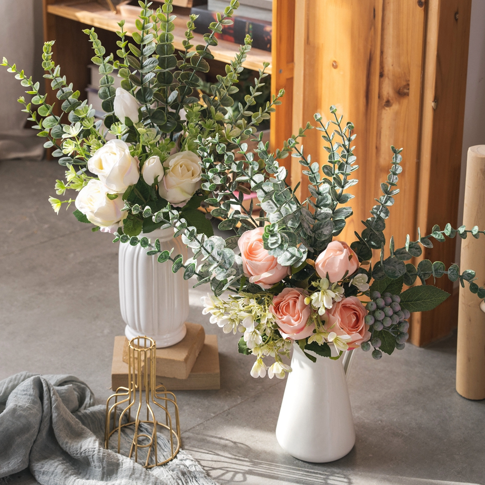 នេះបានក្លែងធ្វើភួងផ្កាកុលាបយូកាលីបទូសជាមួយនឹងសម្រស់ឆើតឆាយប្លែករបស់វា ចូរយើងពិនិត្យមើលឡើងវិញនូវរចនាបថផ្កាកុលាបមួយផ្សេងទៀត។ ផ្កាកុលាបនីមួយៗត្រូវបានផលិតយ៉ាងប្រុងប្រយ័ត្ន ស្រទាប់ផ្កាមានពណ៌ចម្រុះ និងមិនស្អិតដូចស្មារតីនៃធម្មជាតិ រីកយ៉ាងស្ងប់ស្ងាត់។ ស្លឹកបៃតង និងផ្កាកុលាបដ៏ឆ្ងាញ់ពិសារបញ្ចេញពន្លឺគ្នាទៅវិញទៅមក ទាំងសម្រស់ដ៏ឆ្ងាញ់ពិសារនៃផ្កាកុលាប និងដើមយូកាលីបតូសស្រស់ អនុញ្ញាតឱ្យមនុស្សមានអារម្មណ៍ដូចជានៅក្នុងធម្មជាតិ មានអារម្មណ៍ថាបរិសុទ្ធ និងស្រស់ស្អាត។