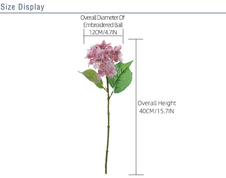 ຂະໜາດ ແລະຮູບຊົງທີ່ຄ້າຍກັບຊີວິດຂອງມັນເຮັດໃຫ້ມັນເປັນສ່ວນໜຶ່ງທີ່ສົມບູນກັບການຈັດດອກໄມ້ ຫຼືເຄື່ອງຕົກແຕ່ງ. ລາຄາລວມມີໜຶ່ງງ່າ, ປະກອບດ້ວຍດອກ hydrangea ໜຶ່ງຊໍ່ ແລະໃບສອງໃບ. ອັນນີ້ສ້າງເປັນຊຸດປະສົມກົມກຽວທີ່ດຶງດູດຫົວໃຈ ແລະ ຈິດໃຈຢ່າງດຽວກັນ. ຫຸ້ມຫໍ່ດ້ວຍຄວາມລະມັດລະວັງ, ຂະຫນາດກ່ອງພາຍໃນແມ່ນ 100 * 24 * 12 ຊມ, ບັນຈຸໄດ້ເຖິງ 78 ຊິ້ນຂອງສາຂາ hydrangea ທີ່ສວຍງາມນີ້.