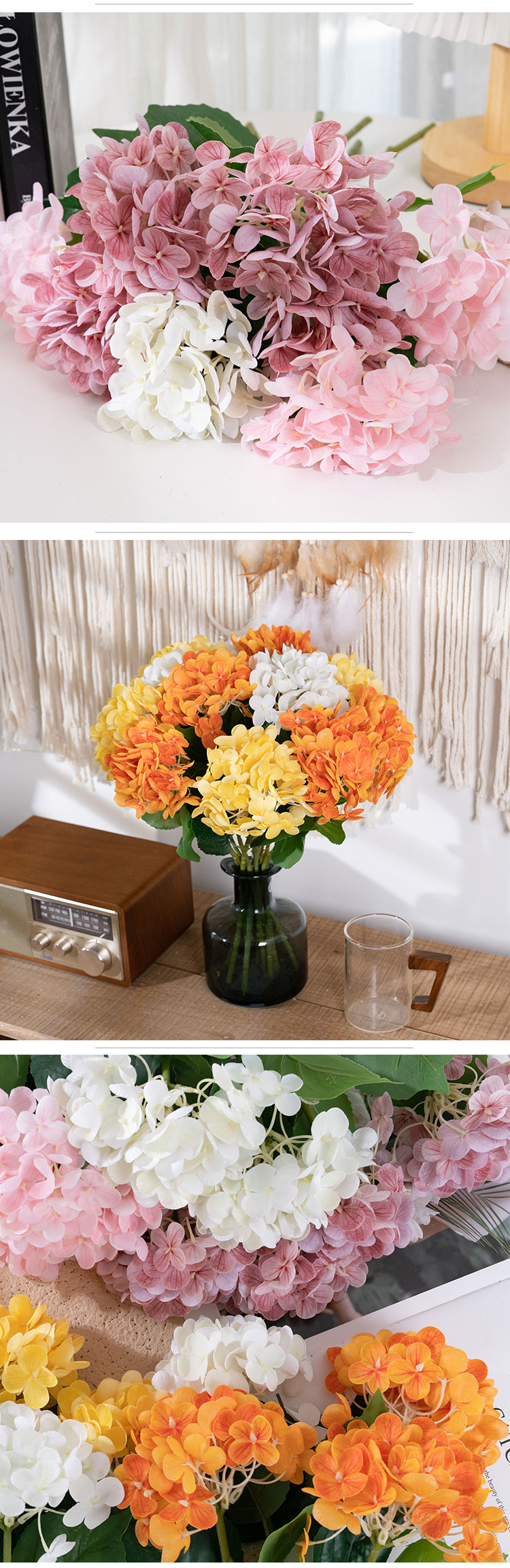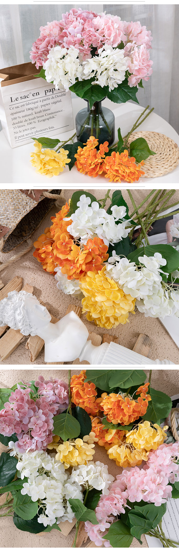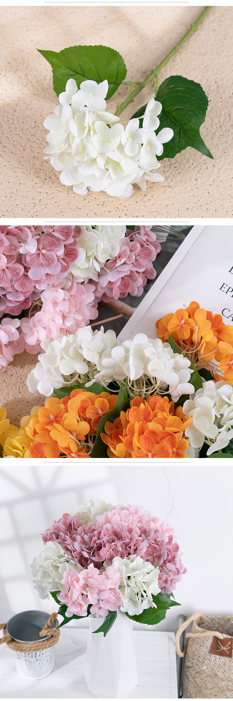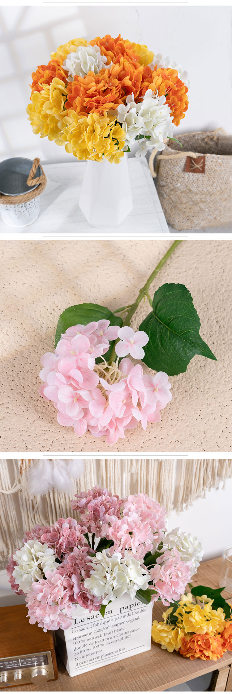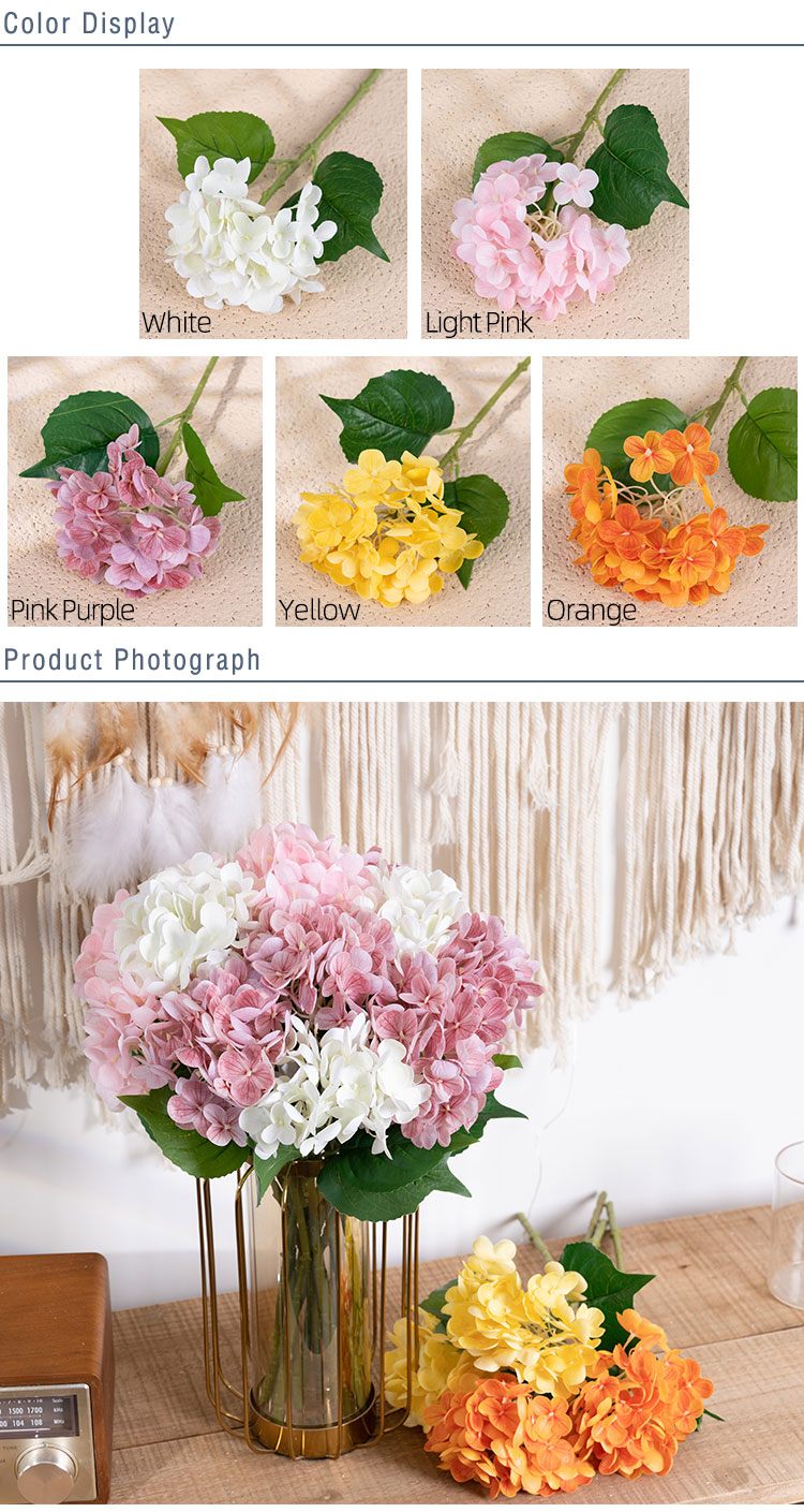 ເລືອກສີທີ່ໃຫ້ຄວາມສົມບູນແບບຂອງເຈົ້າໃຫ້ສົມບູນແບບ ແລະ ເຮັດໃຫ້ມັນເຮັດໃຫ້ສິ່ງອ້ອມຂ້າງຂອງເຈົ້າມີຄວາມສະຫງ່າງາມ ແລະ ມີສະເໜ່. ດ້ວຍການປະສົມປະສານຂອງຄວາມຊຳນານທີ່ເຮັດດ້ວຍມື ແລະ ຄວາມແມ່ນຍໍາຂອງເຄື່ອງຈັກ, ດອກໄຮໂດຣເຈນນີ້ເປັນຫຼັກຖານສະແດງເຖິງສິລະປະ ແລະ ນະວັດຕະກໍາ. versatility ຂອງມັນອະນຸຍາດໃຫ້ມັນເພື່ອເສີມຂະຫຍາຍໂອກາດຕ່າງໆ, ທັງໃນເຮືອນແລະນອກ. ບໍ່ວ່າທ່ານຈະຕົກແຕ່ງເຮືອນ, ຫ້ອງ, ຫ້ອງນອນ, ໂຮງແຮມ, ໂຮງຫມໍ, ສູນການຄ້າ, ຫຼືການຈັດງານແຕ່ງງານ, ກິດຈະກໍາຂອງບໍລິສັດ, ຫຼືການຖ່າຍຮູບ, hydrangea ນີ້ຈະສ້າງຜົນກະທົບທາງສາຍຕາທີ່ຫນ້າຕື່ນຕາຕື່ນໃຈ.