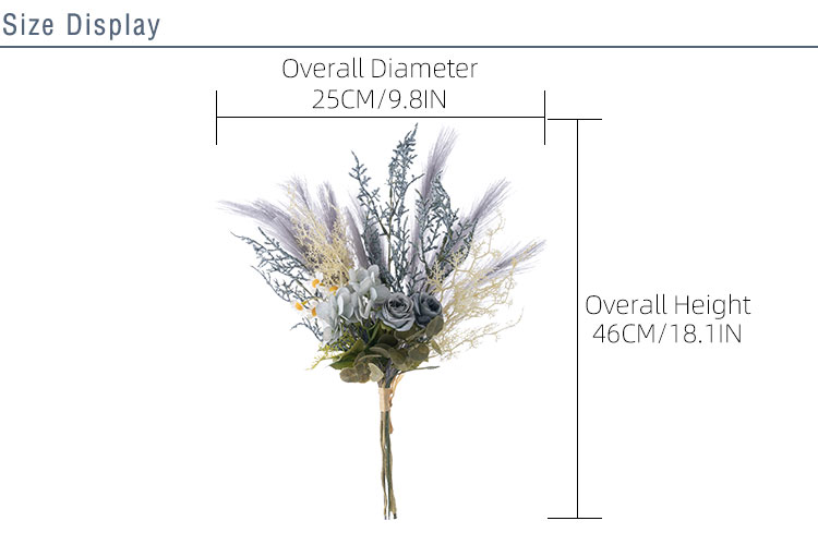 ഉയർന്ന ഗുണമേന്മയുള്ള സാമഗ്രികളുടെ മിശ്രിതം കൊണ്ട് നിർമ്മിച്ച മാമി റോസ് റീഡ് ലെറ്റർ 80% ഫാബ്രിക്, 10% പ്ലാസ്റ്റിക്, 10% ഇരുമ്പ് എന്നിവയിൽ നിന്നാണ് നിർമ്മിച്ചിരിക്കുന്നത്. അതിൻ്റെ മൊത്തത്തിലുള്ള ഉയരം 25CM വ്യാസമുള്ള 46CM ആണ്. റോസാപ്പൂവിൻ്റെ തലയ്ക്ക് 3CM ഉയരവും 3.5CM വ്യാസവും ഉണ്ട്, അതേസമയം ഹൈഡ്രാഞ്ച പുഷ്പ തലയ്ക്ക് ഉദാരമായ 9CM ഉയരവും 8CM വ്യാസവുമുണ്ട്. ഡെയ്സി പൂക്കളുടെ തല അതിൻ്റെ 1.2CM ഉയരവും 2CM വ്യാസവുമുള്ള അതിലോലമായ സ്പർശം നൽകുന്നു. 69 ഗ്രാം മാത്രം ഭാരമുള്ള ഈ കനംകുറഞ്ഞ അലങ്കാരം കൈകാര്യം ചെയ്യാൻ ഒരു കാറ്റ് ആണ്.