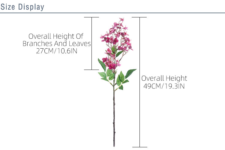 MW82002 Fengjian Small Branch Genkwa – ഏത് സജ്ജീകരണത്തിലും ചാരുതയുടെ ഒരു സ്പർശം ചേർക്കുക. നിങ്ങളുടെ ഇടം വർധിപ്പിക്കാൻ മനോഹരവും അതിലോലമായതുമായ ഒരു അലങ്കാരപ്പണിയാണ് നിങ്ങൾ തിരയുന്നതെങ്കിൽ, Fengjian Small Branch Genkwa-യിൽ കൂടുതൽ നോക്കേണ്ട. ഉയർന്ന ഗുണമേന്മയുള്ള പ്ലാസ്റ്റിക്, ഇരുമ്പ്, തുണികൊണ്ടുള്ള വസ്തുക്കൾ എന്നിവയുടെ സംയോജനത്തിൽ നിന്നാണ് ഈ വിശിഷ്ടമായ ഇനം നിർമ്മിച്ചിരിക്കുന്നത്, ഈടുനിൽക്കുന്നതും ആധികാരികമായ രൂപവും ഉറപ്പുനൽകുന്നു. മൊത്തത്തിൽ 49 സെൻ്റീമീറ്റർ ഉയരമുള്ള ഈ ശാഖയിൽ 8 കൂട്ടം ജെങ്ക്വ പൂക്കൾ ഉണ്ട്, അവയിൽ ഓരോന്നിനും തികച്ചും രൂപകല്പന ചെയ്ത ഇലകൾ ഉണ്ട്. .