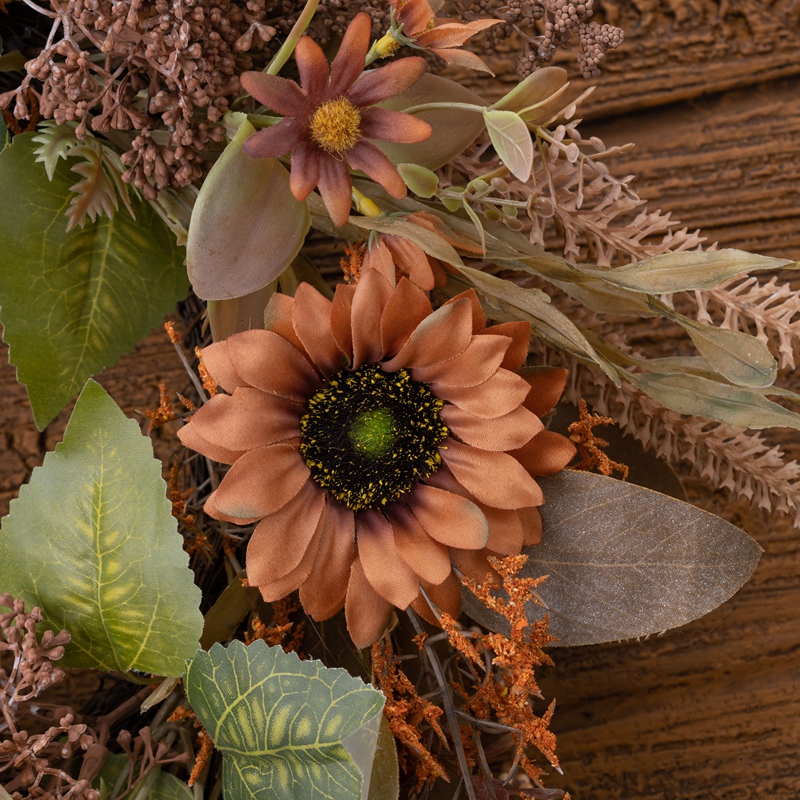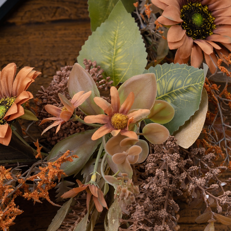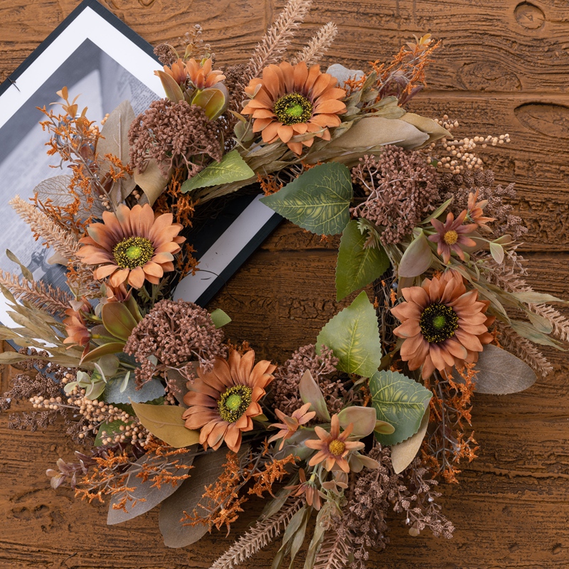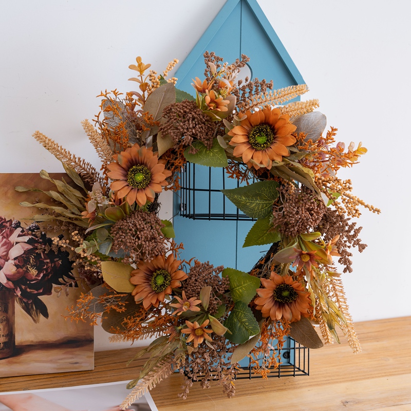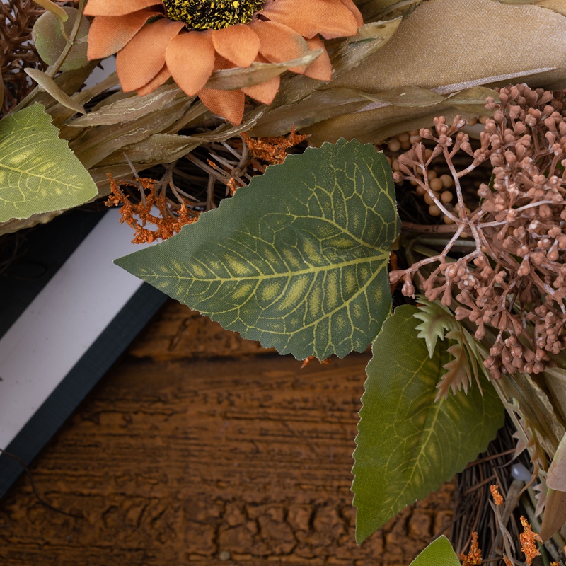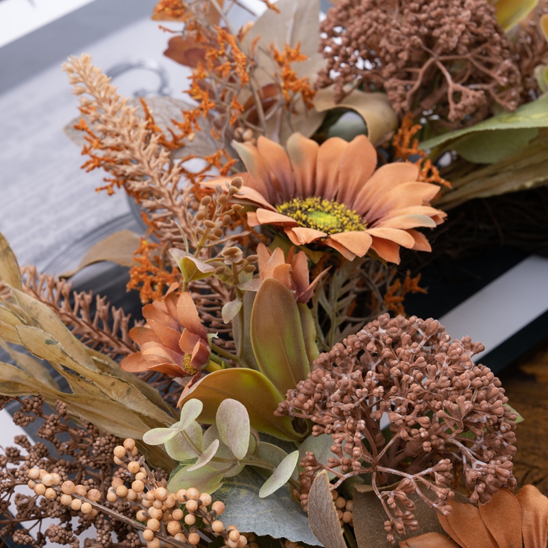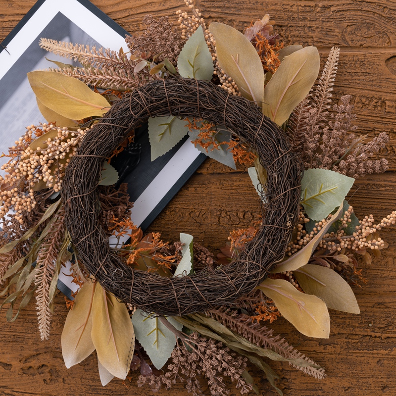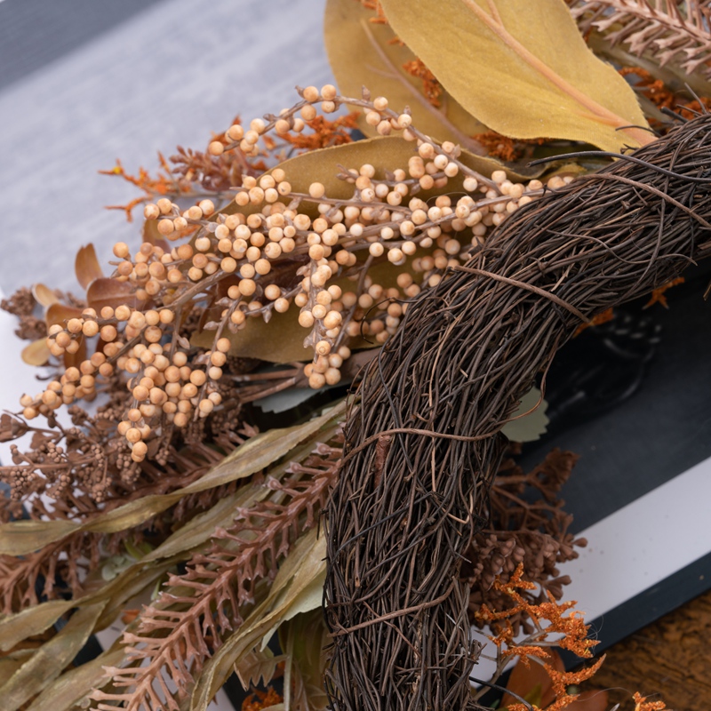 രൂപകല്പനയിൽ സങ്കീർണ്ണമായി നെയ്തെടുത്ത നെൽപ്പഴങ്ങൾ, ശരത്കാലത്തിൻ്റെ സമൃദ്ധമായ വിളവെടുപ്പിന് നാടൻ ചാരുതയും അനുമോദനവും നൽകുന്നു. റിം ശാഖകളും മറ്റ് പുല്ല് ആക്സസറികളും മികച്ച പശ്ചാത്തലമായി വർത്തിക്കുന്നു, അതിഗംഭീരവും ക്ഷണികവുമായ ലാൻഡ്സ്കേപ്പ് സൃഷ്ടിക്കുന്നു, അത് വീടിനുള്ളിൽ പുറത്തേക്ക് കൊണ്ടുവരുന്നു. ഈ ഘടകങ്ങൾ ഒരുമിച്ച് യോജിപ്പിച്ച് ശരത്കാല മഹത്വത്തിൻ്റെ ഒരു ദൃശ്യ സിംഫണി രൂപപ്പെടുത്തുന്നു.