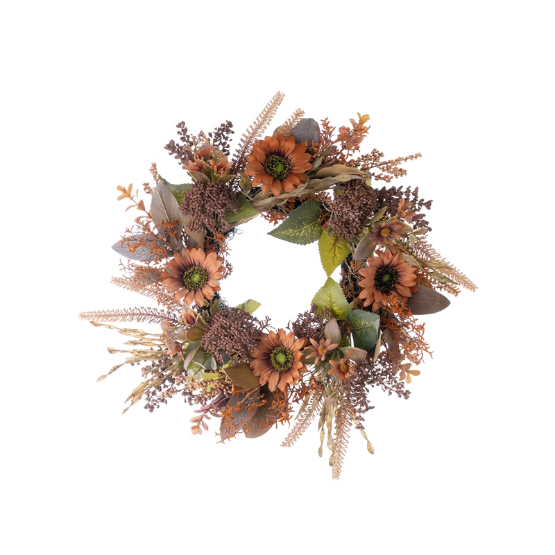 50.8 സെൻ്റീമീറ്റർ ബാഹ്യ വ്യാസവും 25 സെൻ്റീമീറ്റർ ആന്തരിക വളയവും അളക്കുന്ന ഈ സൂര്യകാന്തി റൈസ് ബീൻ മോതിരം കണ്ണുകളെ ആകർഷിക്കാനും ഹൃദയത്തെ കുളിർപ്പിക്കാനും രൂപകൽപ്പന ചെയ്ത ഒരു മഹത്തായ പ്രസ്താവനയാണ്. 2 സെൻ്റീമീറ്റർ ഉയരത്തിൽ ഉയരത്തിൽ നിൽക്കുന്ന സൂര്യകാന്തി തലകൾ, 9 സെൻ്റീമീറ്റർ വ്യാസമുള്ള പുഷ്പ തലയാണ് ഈ ആശ്വാസകരമായ ക്രമീകരണത്തിൻ്റെ കേന്ദ്രബിന്ദു. ഓരോ സൂര്യകാന്തിയും അതിൻ്റെ സ്വാഭാവിക ചാരുത നിലനിർത്താൻ സൂക്ഷ്മമായി രൂപകൽപ്പന ചെയ്തിരിക്കുന്നു, അതിൻ്റെ സ്വർണ്ണ ദളങ്ങൾ സന്തോഷവും പോസിറ്റിവിറ്റിയും പ്രസരിപ്പിക്കുന്നു, പ്രതീക്ഷയുടെയും സൗഹൃദത്തിൻ്റെയും പ്രതീകമാണ്.