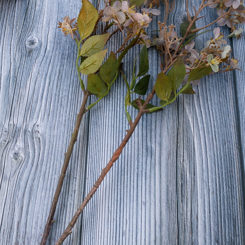 The spec of this floral arrangement is unique, priced as one unit that comprises eight mini hydrangea sprigs and three paired leaves. Each sprig and leaf is crafted with precision, offering a realistic appearance that rivals even the most lush natural flowers. The combination of plastic and fabric materials ensures durability and longevity, while the handmade and machine-assisted techniques lend a touch of artisanal charm.