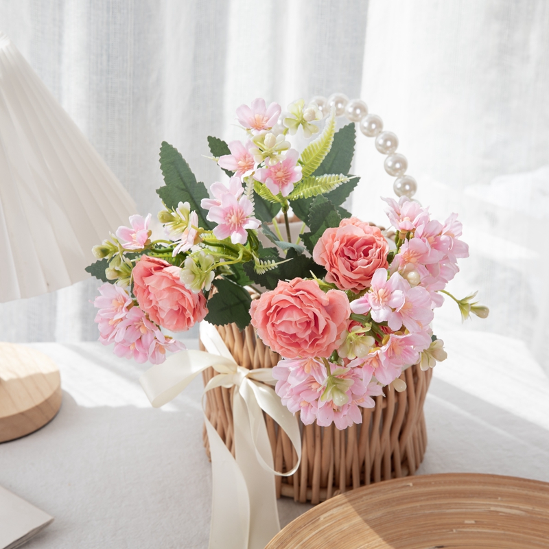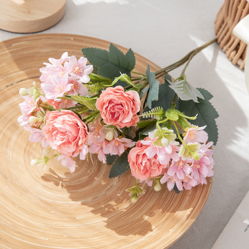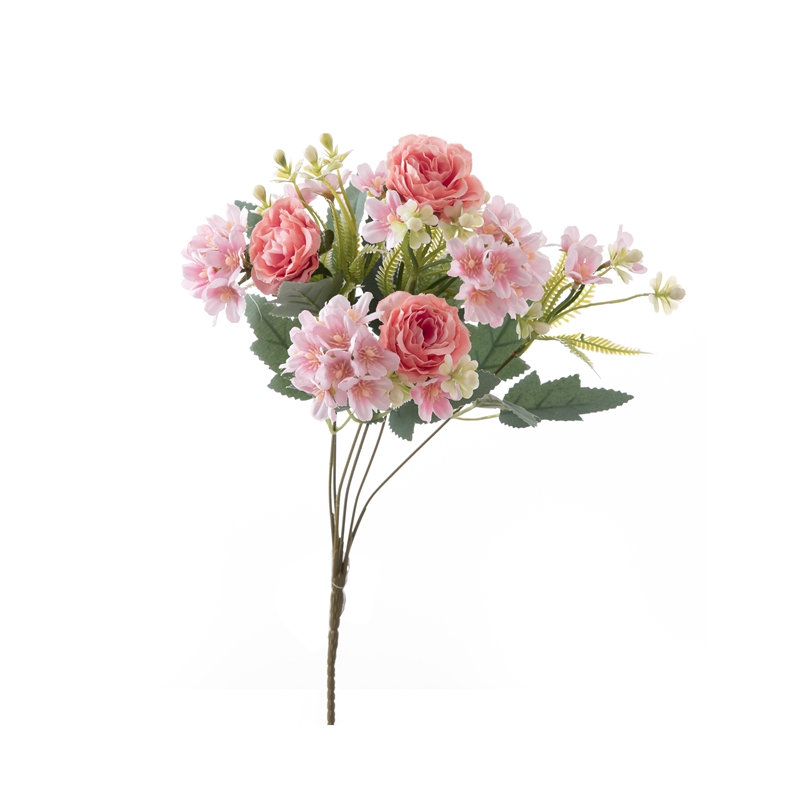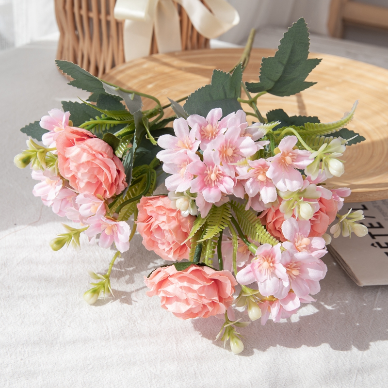 Are you ready to add a touch of elegance and beauty to your space? Look no further than our Item No MW83521 exquisite 6 pronged rose clove bouquet! With its lifelike appearance and vibrant colors, this bouquet is sure to captivate anyone who lays their eyes on it.Made with high-quality materials including fabric, plastic, and wire, this bouquet is built to last. The overall height of the bouquet is 35CM, making it the perfect size to fit on any tabletop or shelf. The rose heads have a diameter of 4.5CM and a height of 2.5CM, while the lilac flower heads have a diameter of 2.8CM.