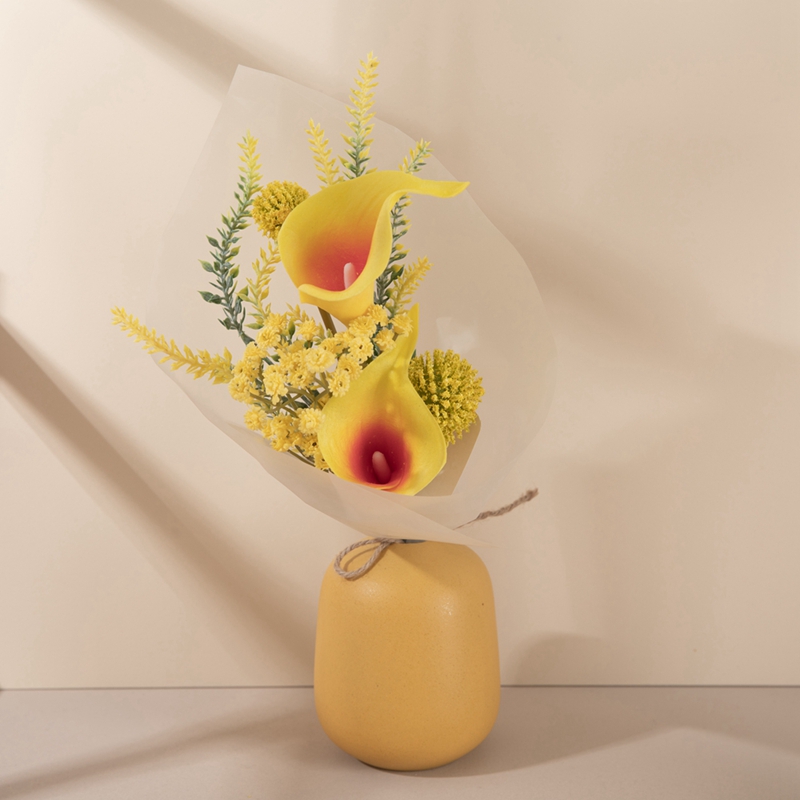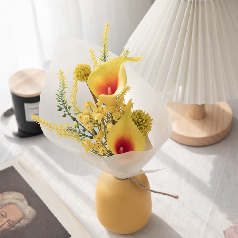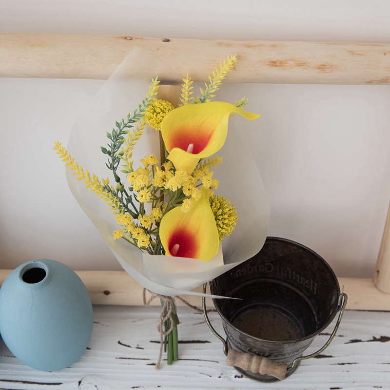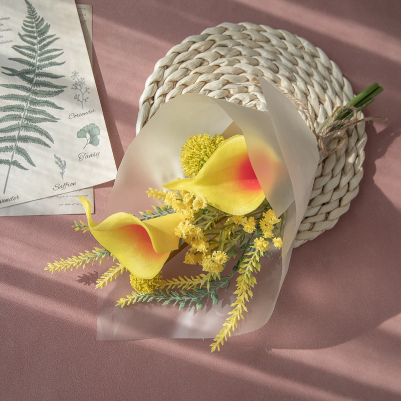 The main flower chosen is the elegant and upright calla lily, which inherently has a cold yet gentle sophistication, like an elegant dancer, standing quietly in the center of the bouquet. Paired with the small and lively ball flowers, the round and cute shapes are dotted among the leaves, breaking the monotony of a single flower type and injecting a touch of liveliness and individuality into this tenderness, making the bouquet more vivid and three dimensional, avoiding monotony. It not only balances the overall visual effect but also adds a touch of raw naturalness to the bouquet.