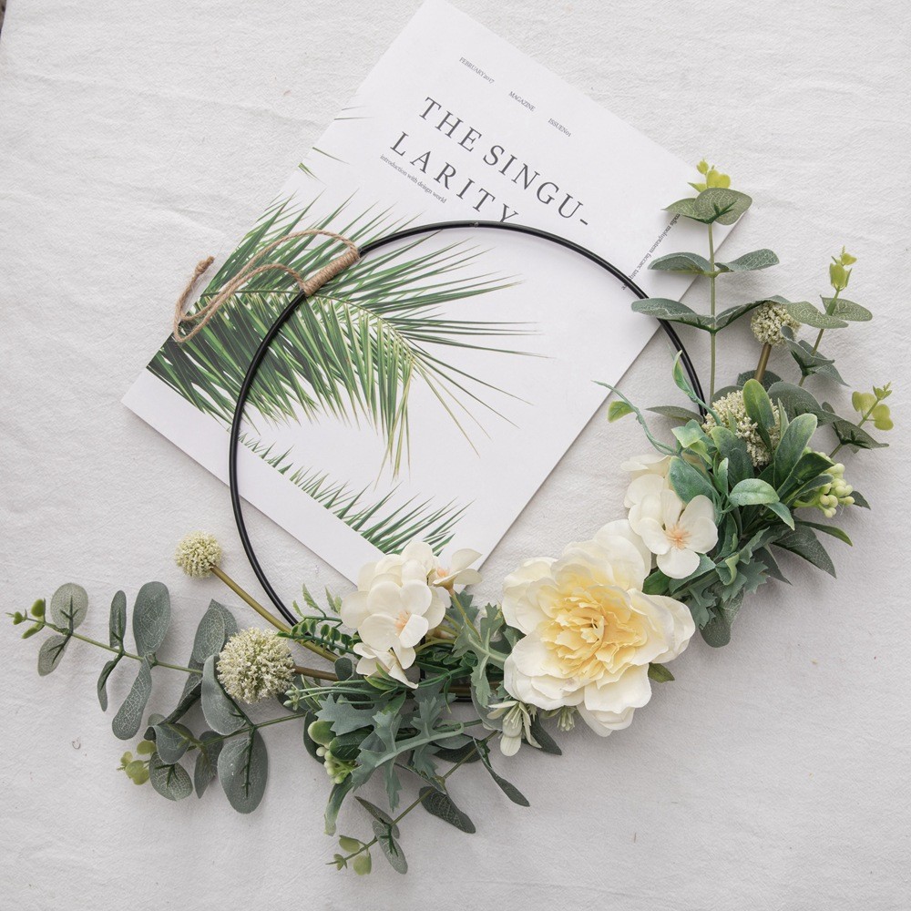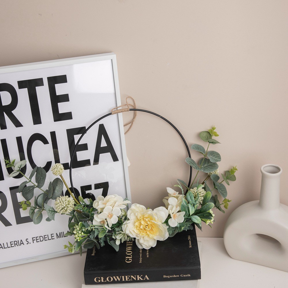 This garland consists of camellia, hydrangea, eucalyptus leaf, foam fruit and other leaves. Camellia has long been regarded as a symbol of beauty.