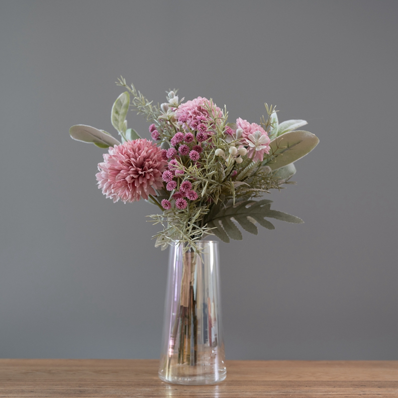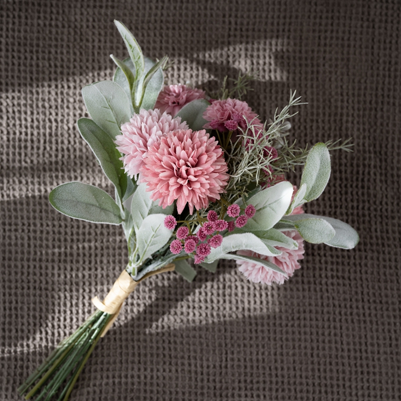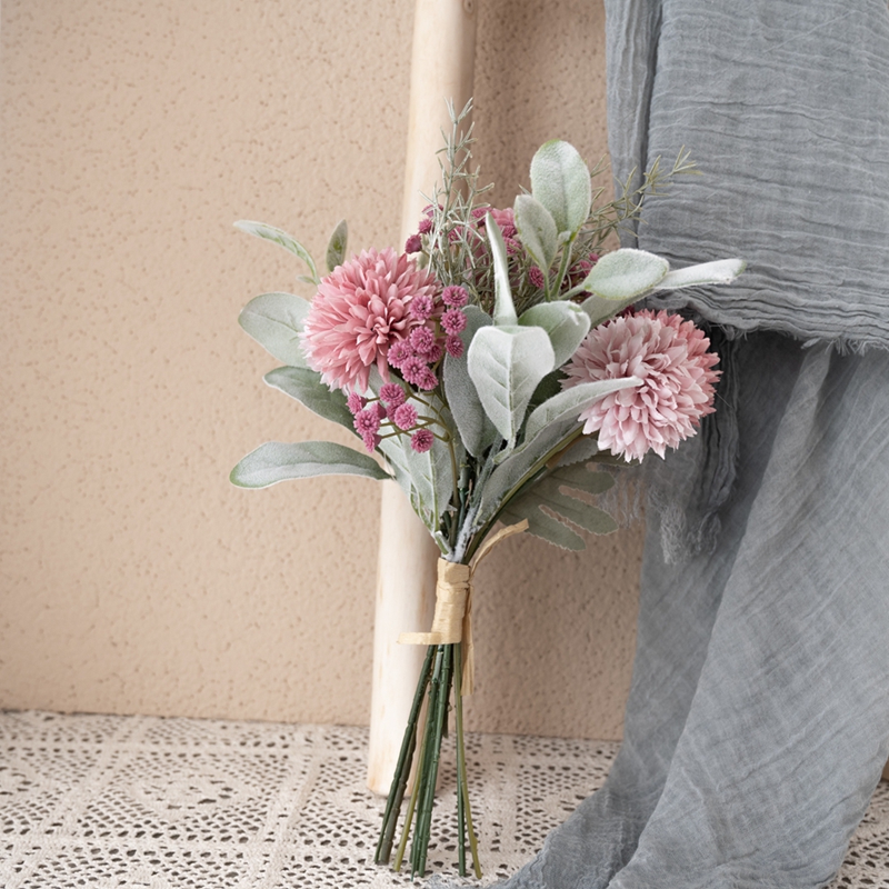 The round and plump flowers of the ball daisy are like a series of delicate little, closely clustered together, emitting a charming and playful aroma. The shooting stars are like the twinkling stars in the night sky, small and numerous, scattered here and there around the globe lilies. And the bunch of filler leaves is the finishing touch of this bouquet. The leaf bunches not only provide a backdrop for the globe thistle and the star-of-bethlehem, but also make the entire bouquet appear more plump and well-structured.