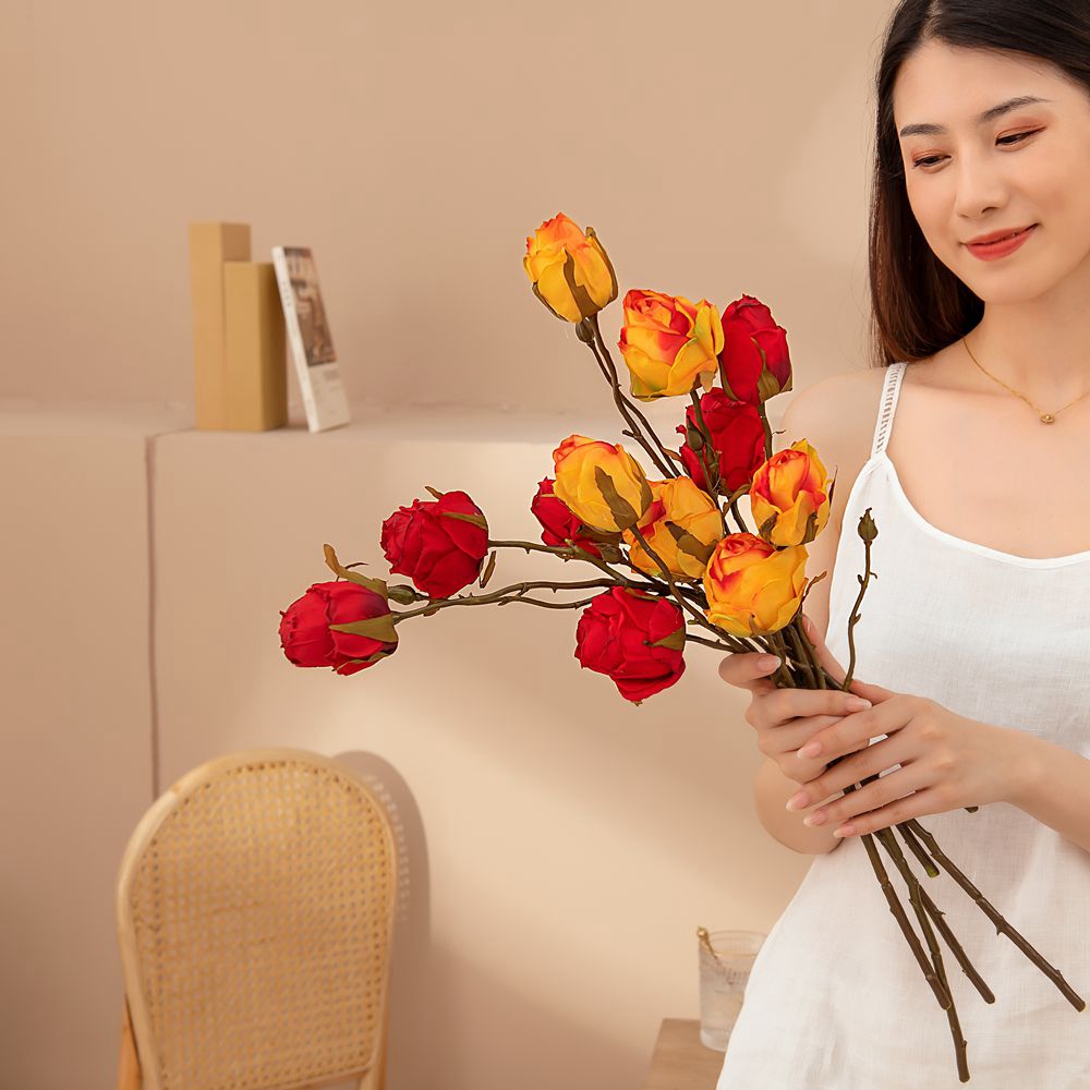 The decorative effect of simulating a single dry-burned rose is closely related to its matching with home style. In a Nordic style home, we can choose simple and delicate two-pronged dry-burned rose single branches, with white or wood colored furniture and decorations, to create a fresh and natural atmosphere.