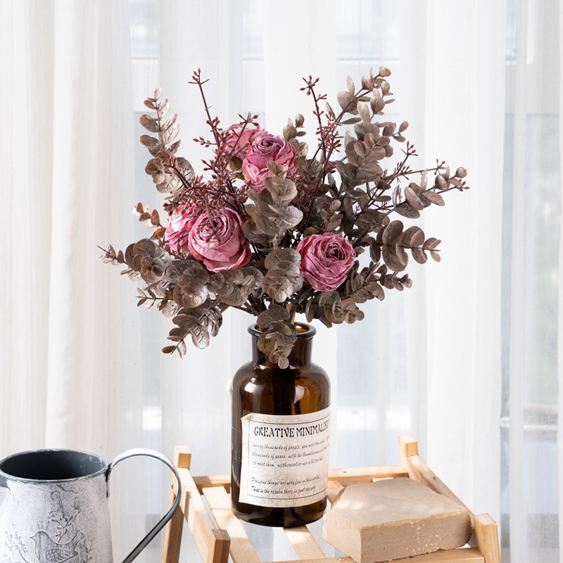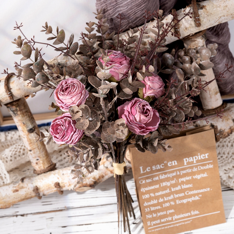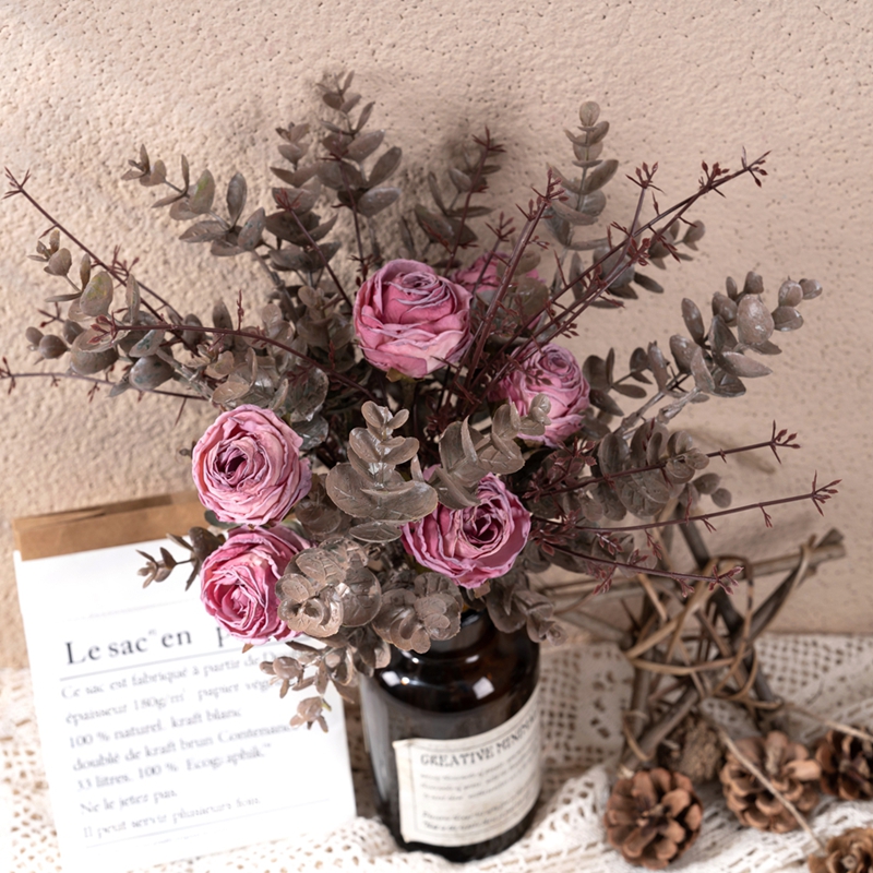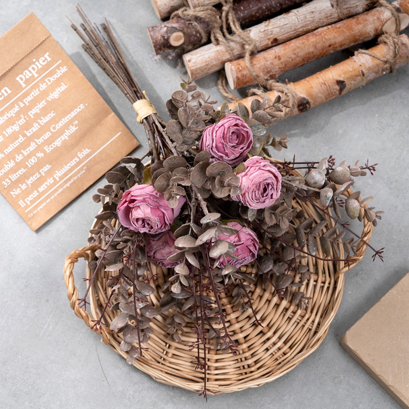 Boeketten van drooggebrande rozen verschillen van de volle, vochtige en verleidelijke uitstraling van verse rozen. Na het droogbranden verliezen de rozenblaadjes hun vroegere volle glans en glans, verschrompelen en rimpelen, alsof het water genadeloos door de tijd is weggezogen. De kleuren zijn niet langer helder en levendig, maar hebben hun intense tinten verloren en vertonen een eenvoudige en doffe textuur, alsof ze zijn verhuld door een dunne sluier van de tijd.