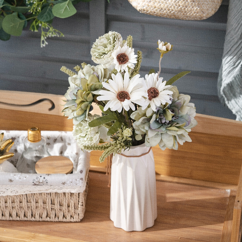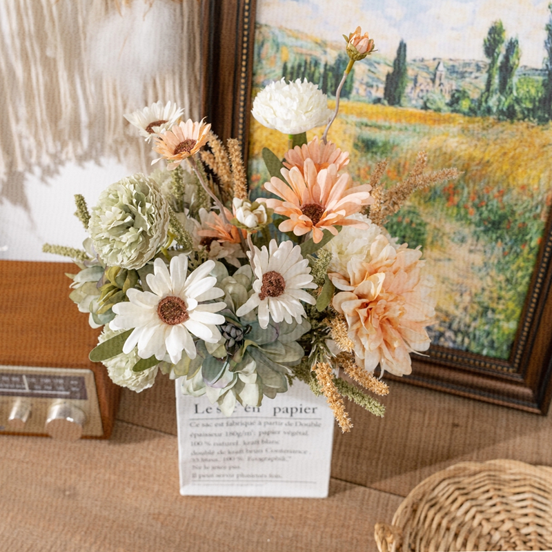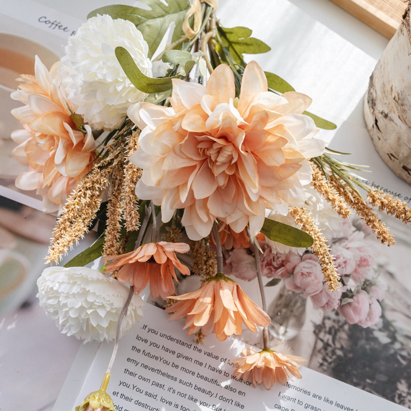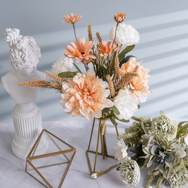 In de wereld van bloemdecoratieKunstbloemen, met hun blijvende schoonheid en unieke creativiteit, bezorgen mensen een uniek visueel genot. Wanneer chrysanten, lotussen en dahlia's samenkomen en zorgvuldig in een boeket worden gerangschikt, is het als een groots feest van florale esthetiek, bloeiend met verbluffende glans, de schoonheid van de natuur perfect combinerend met artistiek vakmanschap, en grenzeloze poëzie en romantiek toevoegend aan het leven.