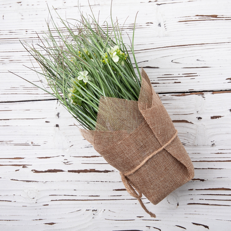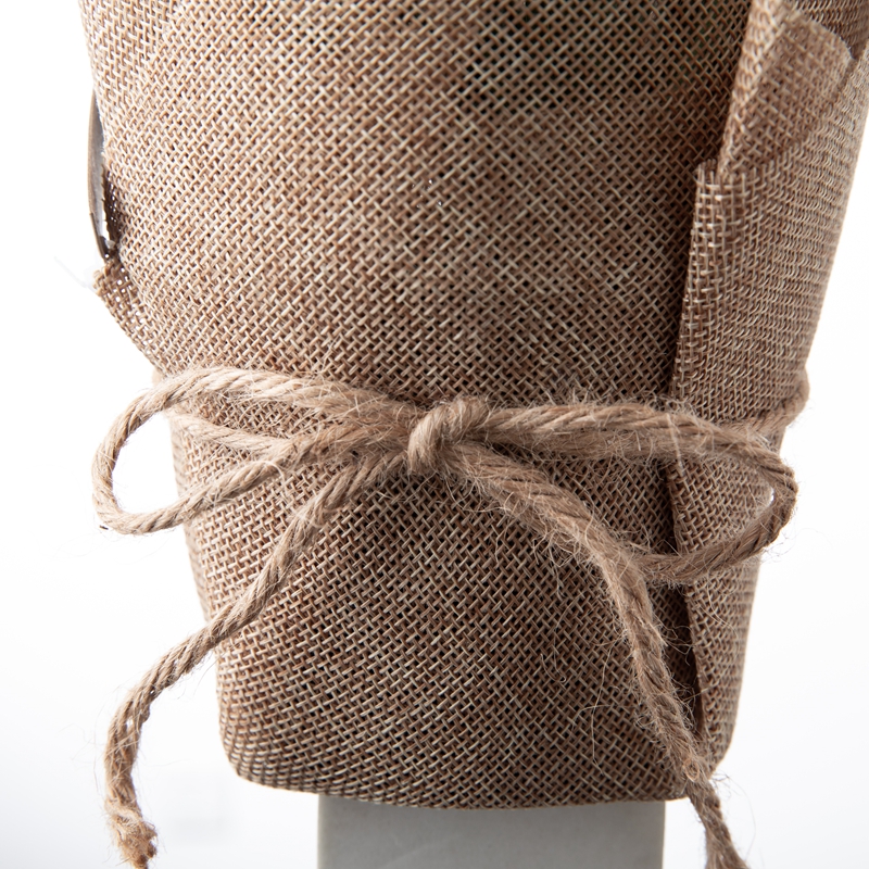 Kuphatikizira kukongola kwachilengedwechi ndi matumba awiri ansalu akulu akulu, chilichonse chokhala ndi mbali ya 31cm, chopangidwa kuchokera ku nsalu yofewa komanso yopumira. Matumbawa samangowonjezera kukopa kwa rustic pamapangidwe onse komanso amakhala ngati yankho lothandiza pakunyamula kapena kusunga malo anu amtengo wapatali. Matumbawo amangiriridwa pamodzi ndi chingwe cholimba cha hemp, chokongoletsedwa ndi uta, kufotokozera mutu wachilengedwe komanso kupititsa patsogolo kukongola kwa rustic.