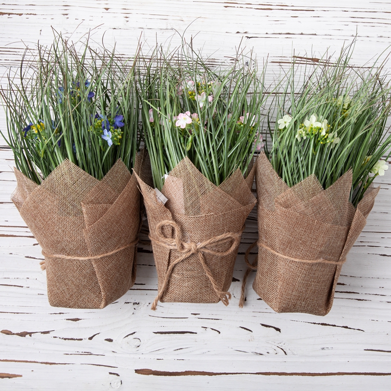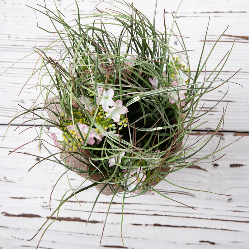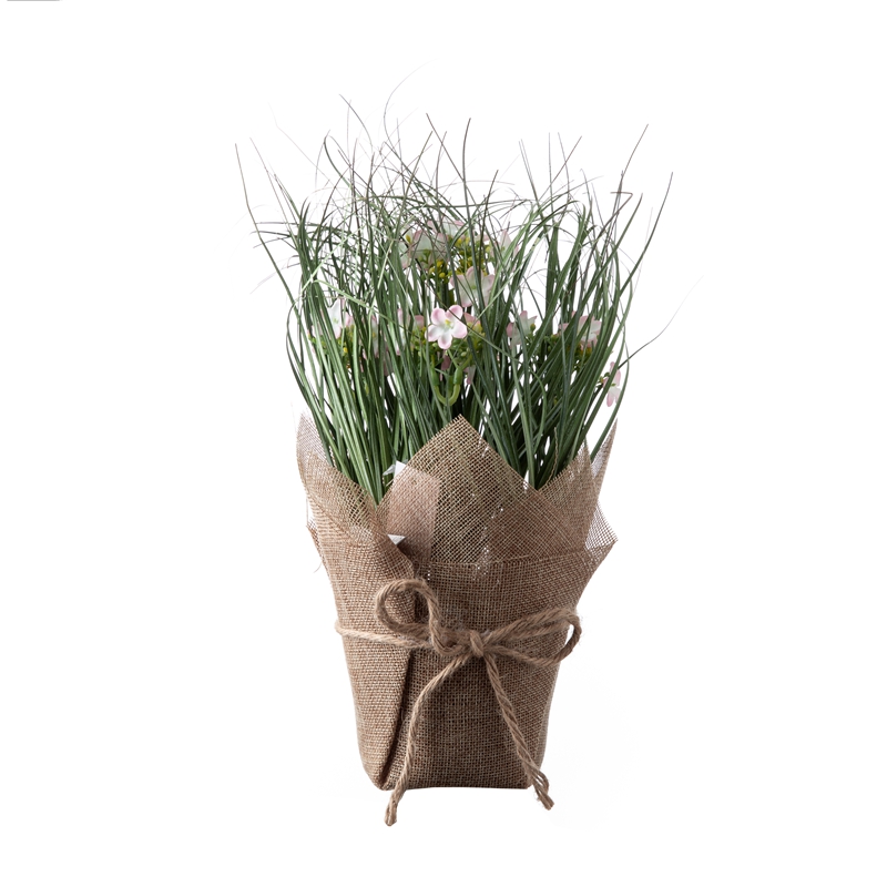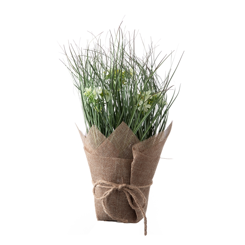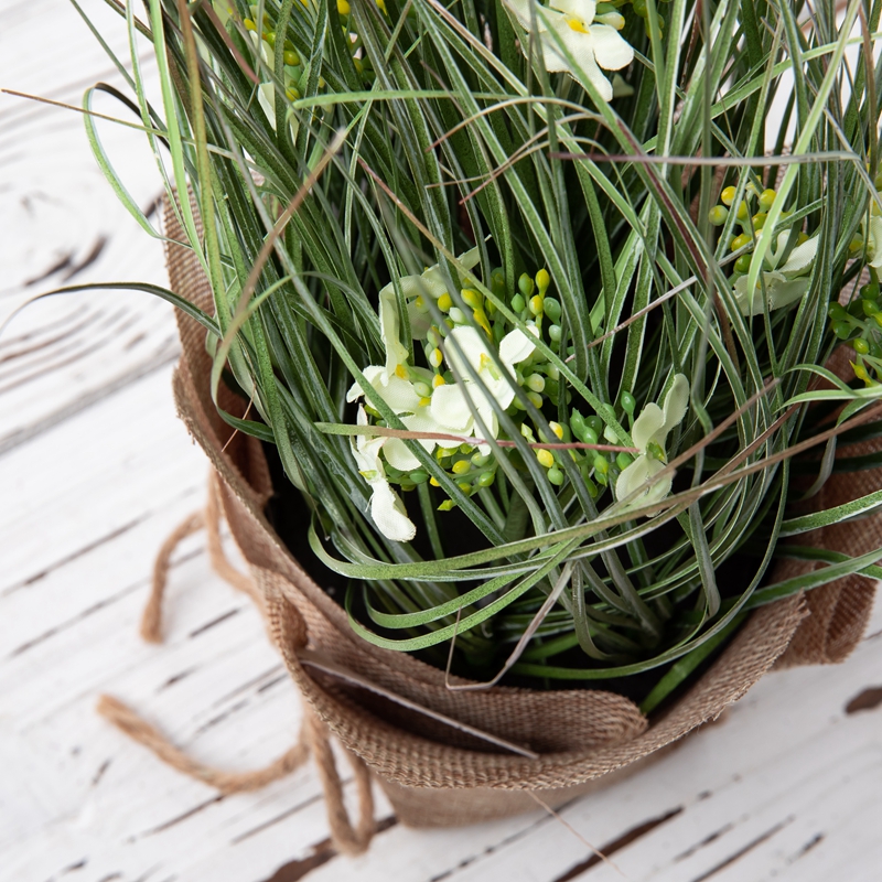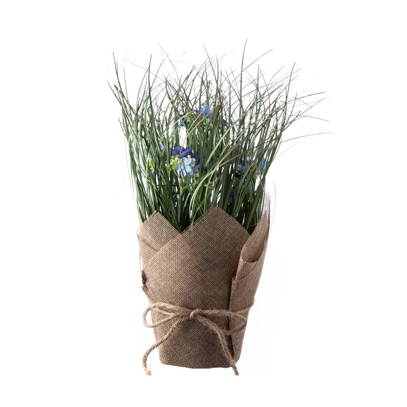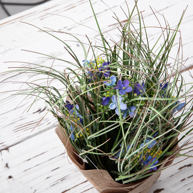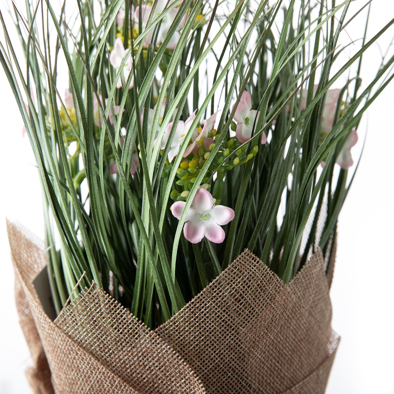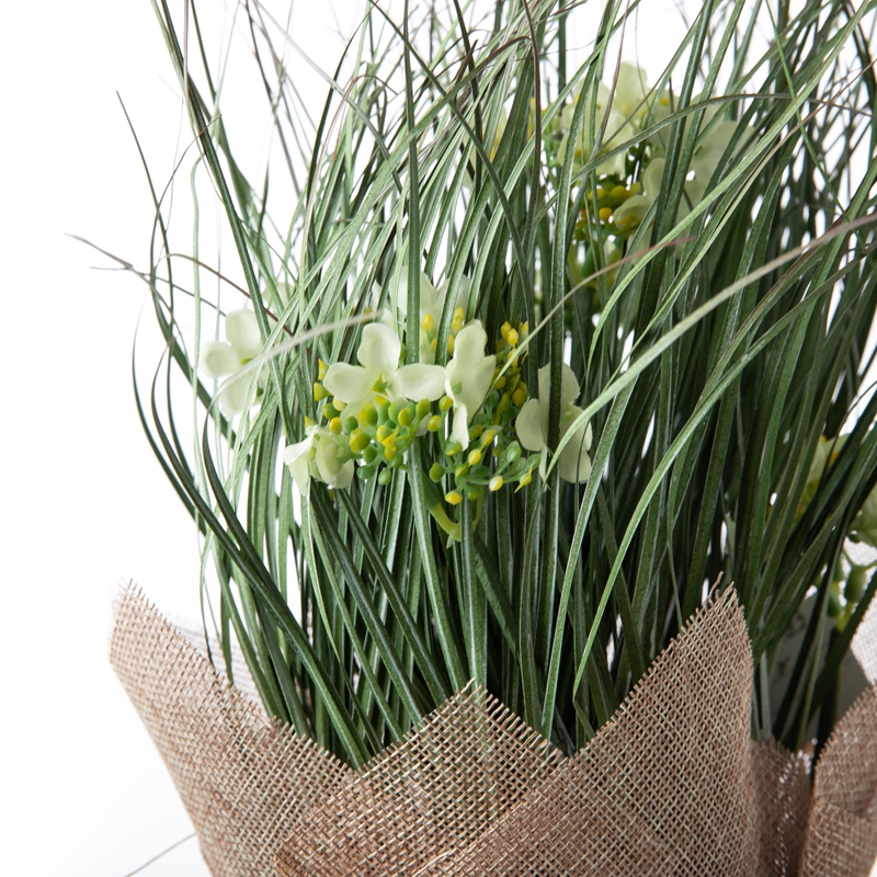 Chochititsa chidwi kwambiri ndi malo okongolawa mosakayikira ndi kuphatikiza kocholowana kwa magulu 7 a udzu wobiriwira wa bango, wolumikizana ndi magulu 5 a udzu wa bango wokongoletsedwa ndi katchulidwe ka maluwa. Kuphatikizika kosamalitsa kumeneku kumapanga mawonekedwe ogwirizana a masamba ndi mitundu, monga dambo labata, kuyitanitsa bata m'malo otanganidwa kwambiri. Maluwawo, ngakhale kuti ndi ochita kupanga, amatsanzira bwino kwambiri za chilengedwe ndi zinthu zenizeni zamatsenga, zomwe zimachititsa kuti azioneka okongola kwa nthawi yaitali omwe amafunikira kusamalidwa pang'ono.