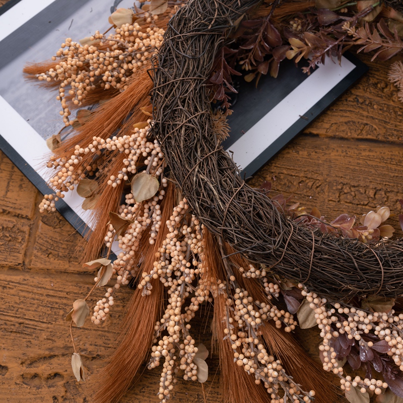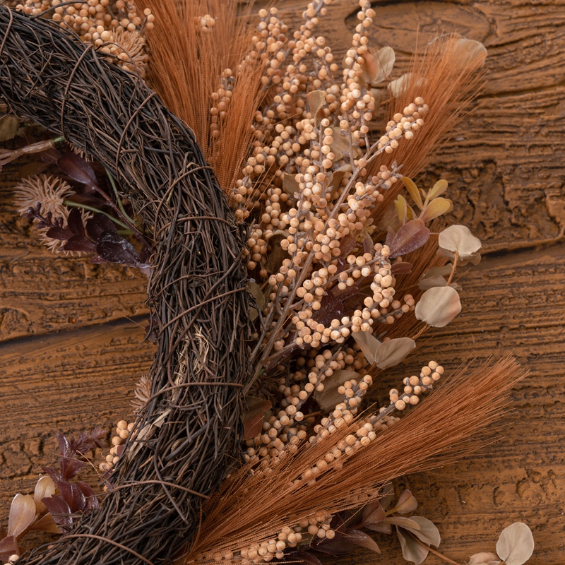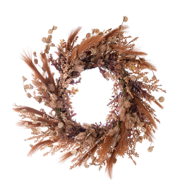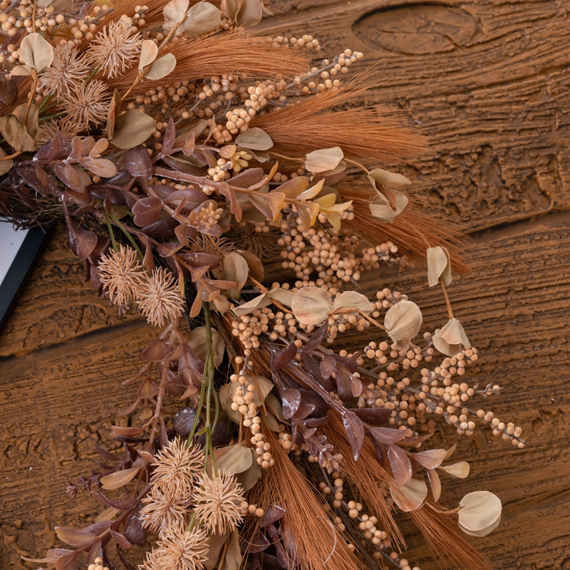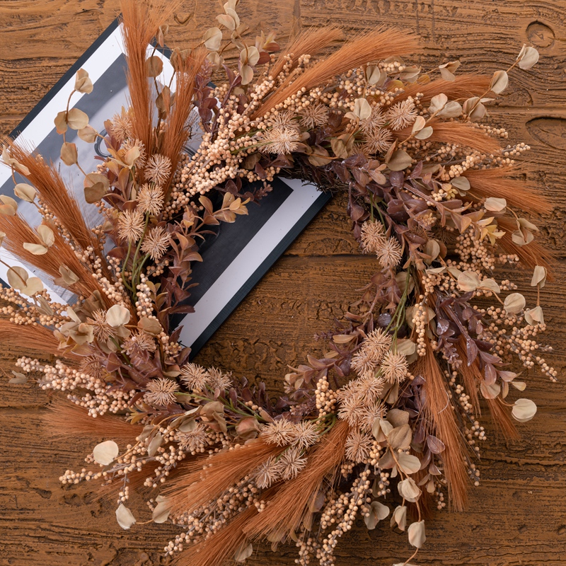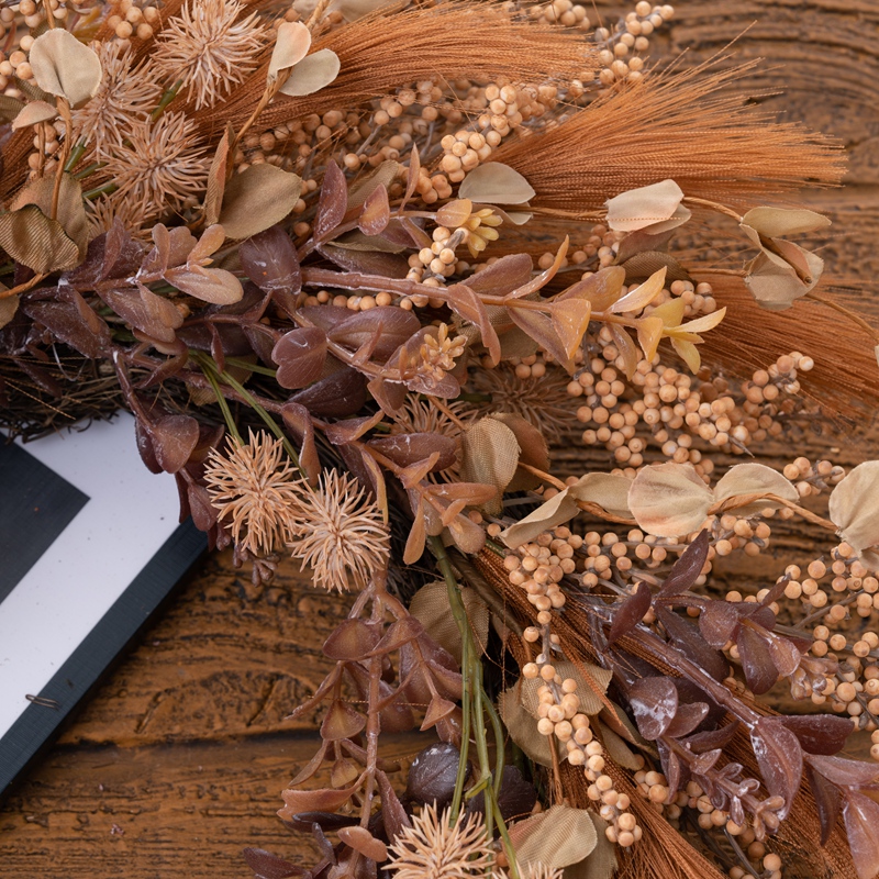 Boasting an impressive overall outer ring diameter of 50.8cm and an inner ring diameter of 30cm, PL24012 commands attention with its imposing yet graceful presence. At the core of this stunning decoration lies the spiny ball, a symbol of resilience and strength, artfully woven amidst a lush tapestry of eucalyptus leaves, fluffy grass, foam branches, a wooden branch ring, and other exquisite grass accessories.
