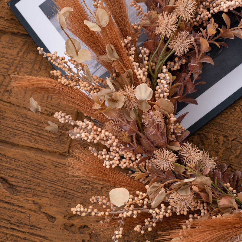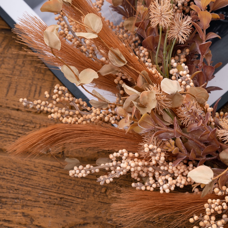 The harmony between handmade finesse and machine precision is palpable in every aspect of PL24012. Skilled artisans meticulously select and arrange each element, ensuring that the spiny balls stand tall and proud, their sharp edges softened by the gentle touch of the eucalyptus leaves and fluffy grass. The foam branches add a touch of textural depth, while the wooden branch ring serves as a sturdy foundation, uniting all the elements into a cohesive masterpiece.