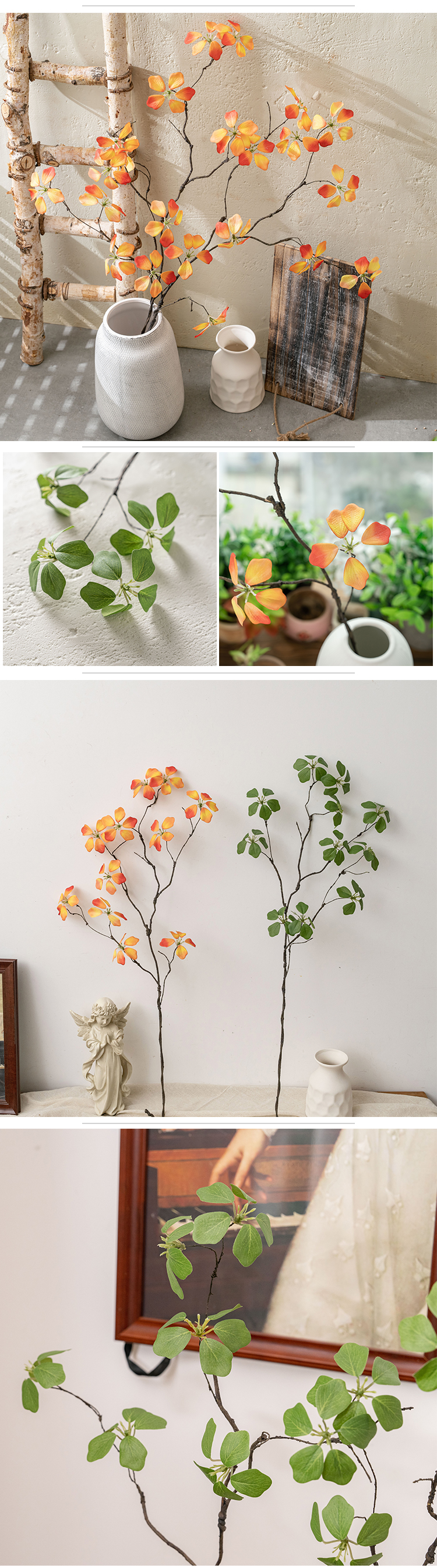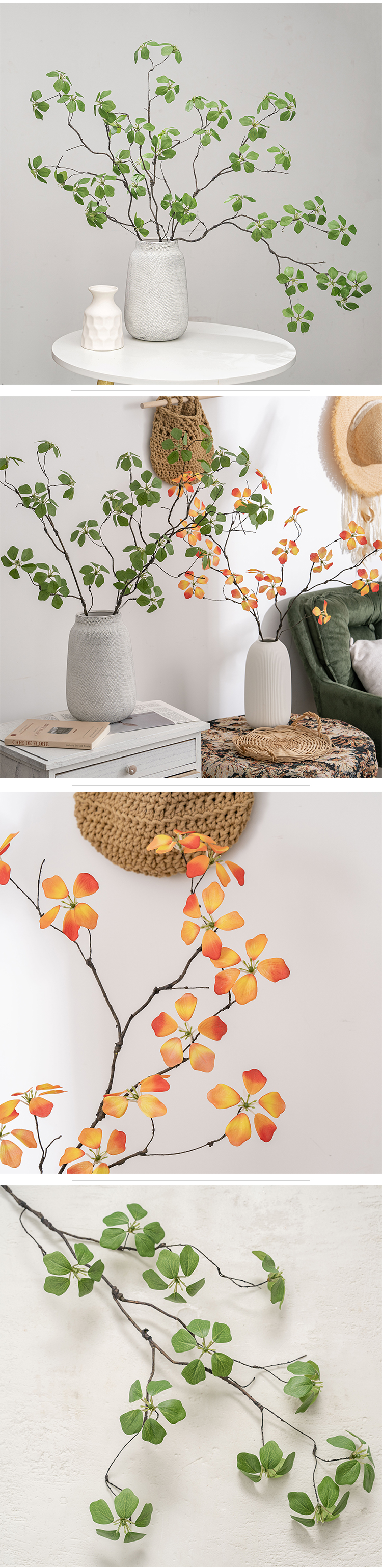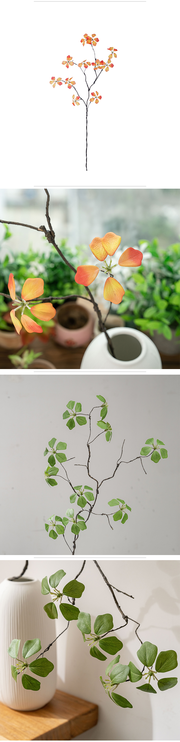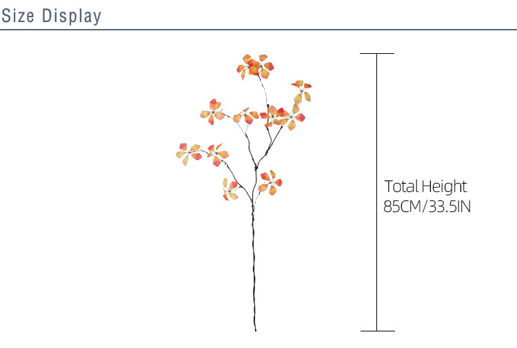 Kitambaa huacha majani halisi, huku kiini cha waya cha ndani kikiruhusu umbo rahisi kutoshea vases, mipangilio, au miradi ya DIY. Kwa bei ya kila shina moja, inatoa uhuru wa kununua kile unachohitaji bila oda za chini zinazohitajika. Kwa wanunuzi wa jumla, shina hufungashwa kwa ufanisi katika visanduku vya ndani vya 100*24*12CM, vikiwa na vipande 30 kwa kila sanduku, kuhakikisha usafiri salama na uhifadhi rahisi.