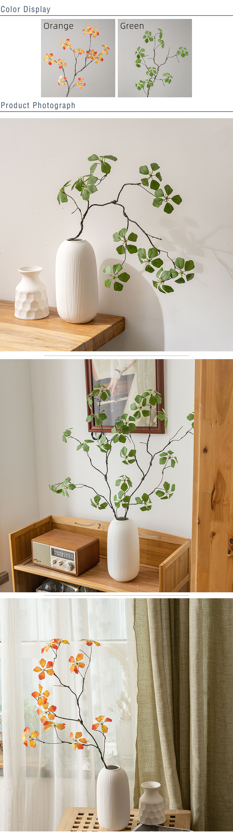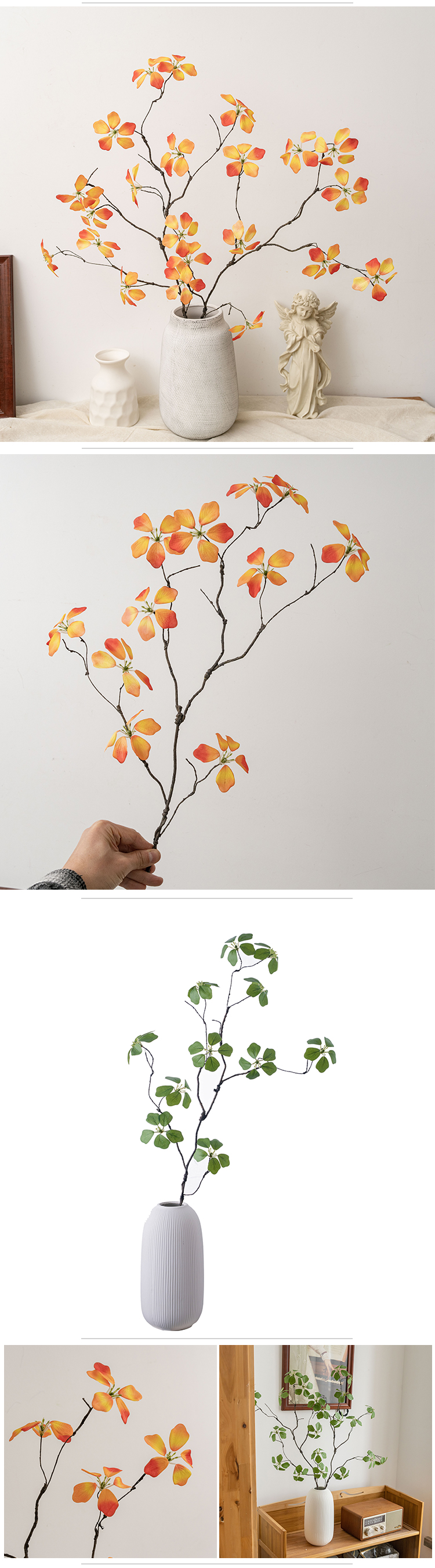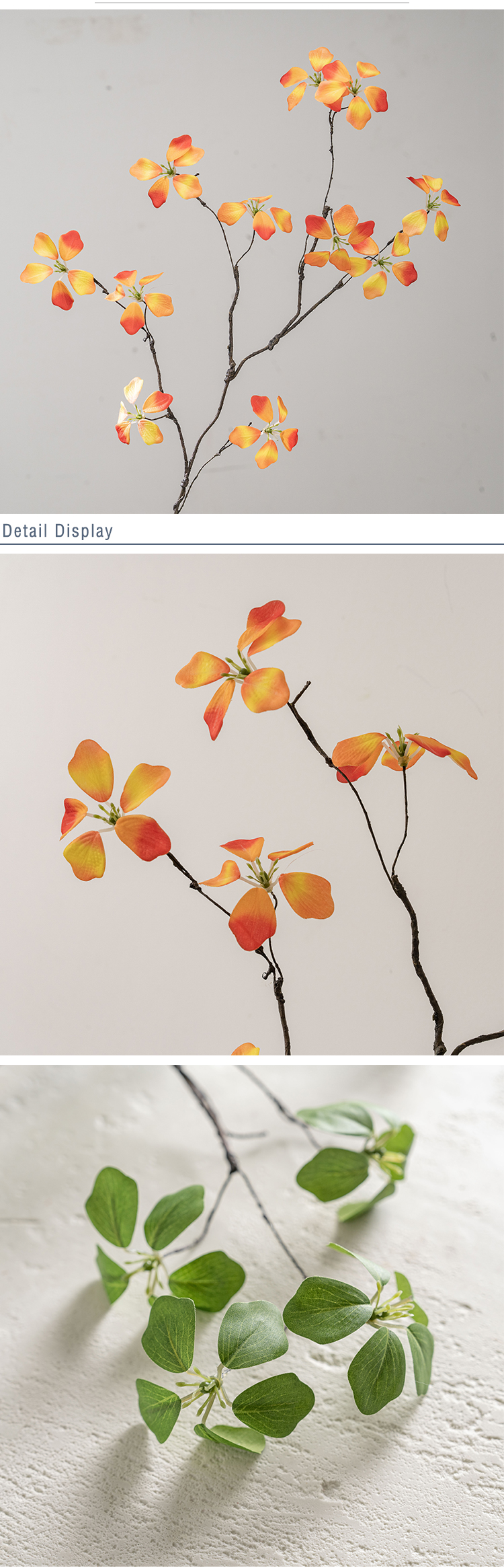 Kitambaa huacha majani halisi, huku kiini cha waya cha ndani kikiruhusu umbo rahisi kutoshea vases, mipangilio, au miradi ya DIY. Kwa bei ya kila shina moja, inatoa uhuru wa kununua kile unachohitaji bila oda za chini zinazohitajika. Kwa wanunuzi wa jumla, shina hufungashwa kwa ufanisi katika visanduku vya ndani vya 100*24*12CM, vikiwa na vipande 30 kwa kila sanduku, kuhakikisha usafiri salama na uhifadhi rahisi.