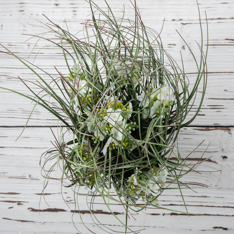 ఈ బోన్సాయ్ యొక్క నిజమైన అందం దాని 9 బంచ్ల లష్ రెల్లు గడ్డి యొక్క క్లిష్టమైన అమరికలో ఉంది, ప్రతి ఒక్కటి లోతు మరియు కదలిక యొక్క భావాన్ని సృష్టించడానికి ఖచ్చితంగా ఉంచబడుతుంది. ఈ రెల్లు మధ్య అల్లుకున్న 6 రెల్లు గడ్డి, సున్నితమైన విరిగిన పువ్వులతో అలంకరించబడి, మొత్తం డిజైన్కు విచిత్రమైన మరియు చక్కదనం యొక్క స్పర్శను జోడిస్తుంది. పువ్వులు, ఉద్దేశపూర్వకంగా అసంపూర్ణంగా ఉన్నప్పటికీ, మోటైన మరియు మంత్రముగ్ధులను చేసే మనోజ్ఞతను వెదజల్లుతుంది, అసంపూర్ణత యొక్క అందాన్ని ఆస్వాదించడానికి వీక్షకులను ఆహ్వానిస్తుంది.
