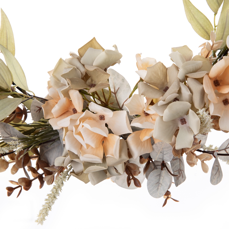ดอกไฮเดรนเยียที่อยู่ใจกลางพวงดอกไม้นี้เป็นเครื่องพิสูจน์ถึงความงดงามของฤดูใบไม้ร่วง ด้วยสีสันที่สดใสและเข้มข้นตั้งแต่สีชมพูบลัชออนไปจนถึงสีม่วงเข้ม ดอกไม้เหล่านี้ให้ความรู้สึกอบอุ่นและสบาย ทำให้เป็นตัวเลือกที่สมบูรณ์แบบสำหรับการเฉลิมฉลองฤดูกาลที่เปลี่ยนแปลง การเพิ่มใบไผ่และใบยูคาลิปตัสช่วยเพิ่มความลึกและพื้นผิว สร้างเอฟเฟกต์สามมิติที่ทั้งดึงดูดสายตาและน่าพึงพอใจ